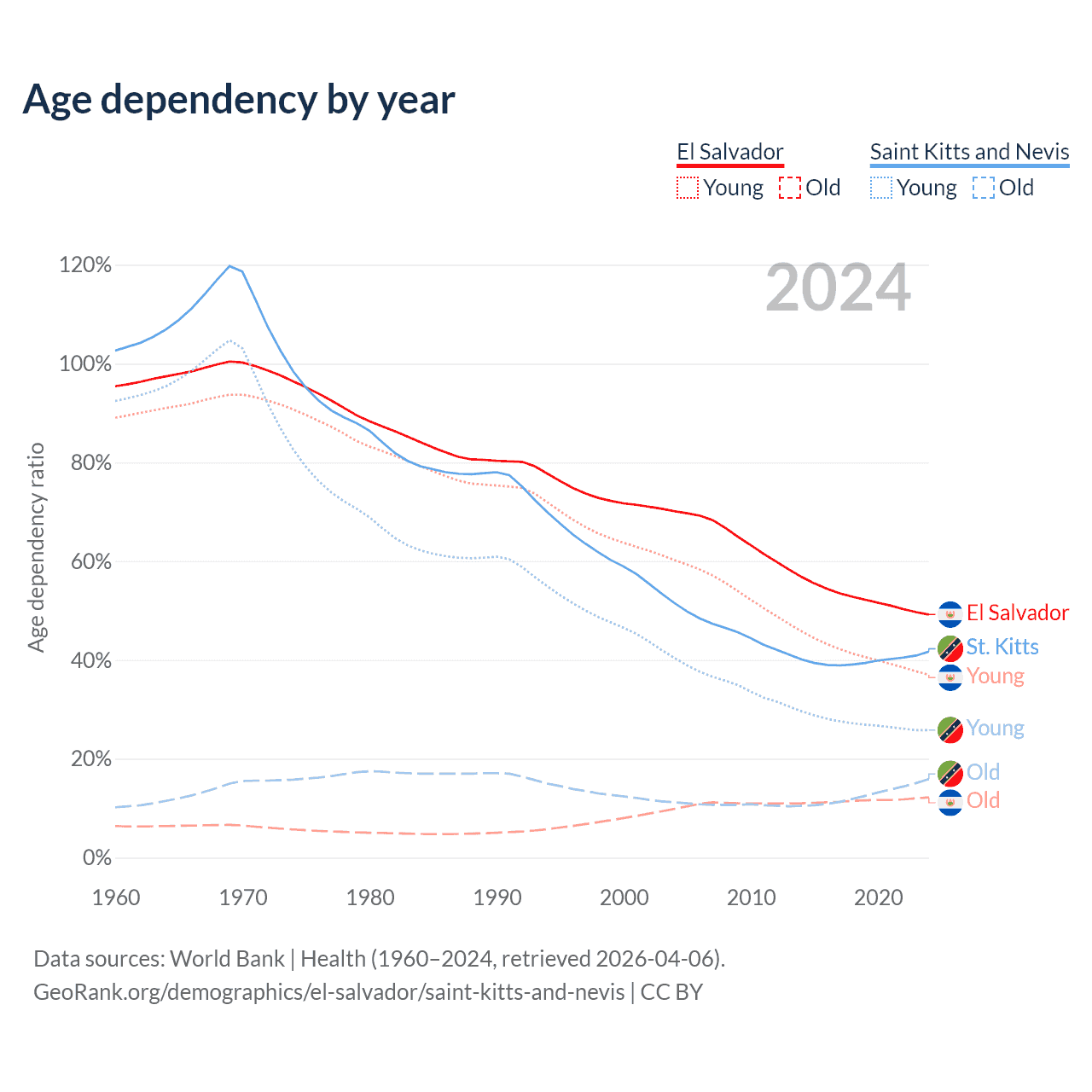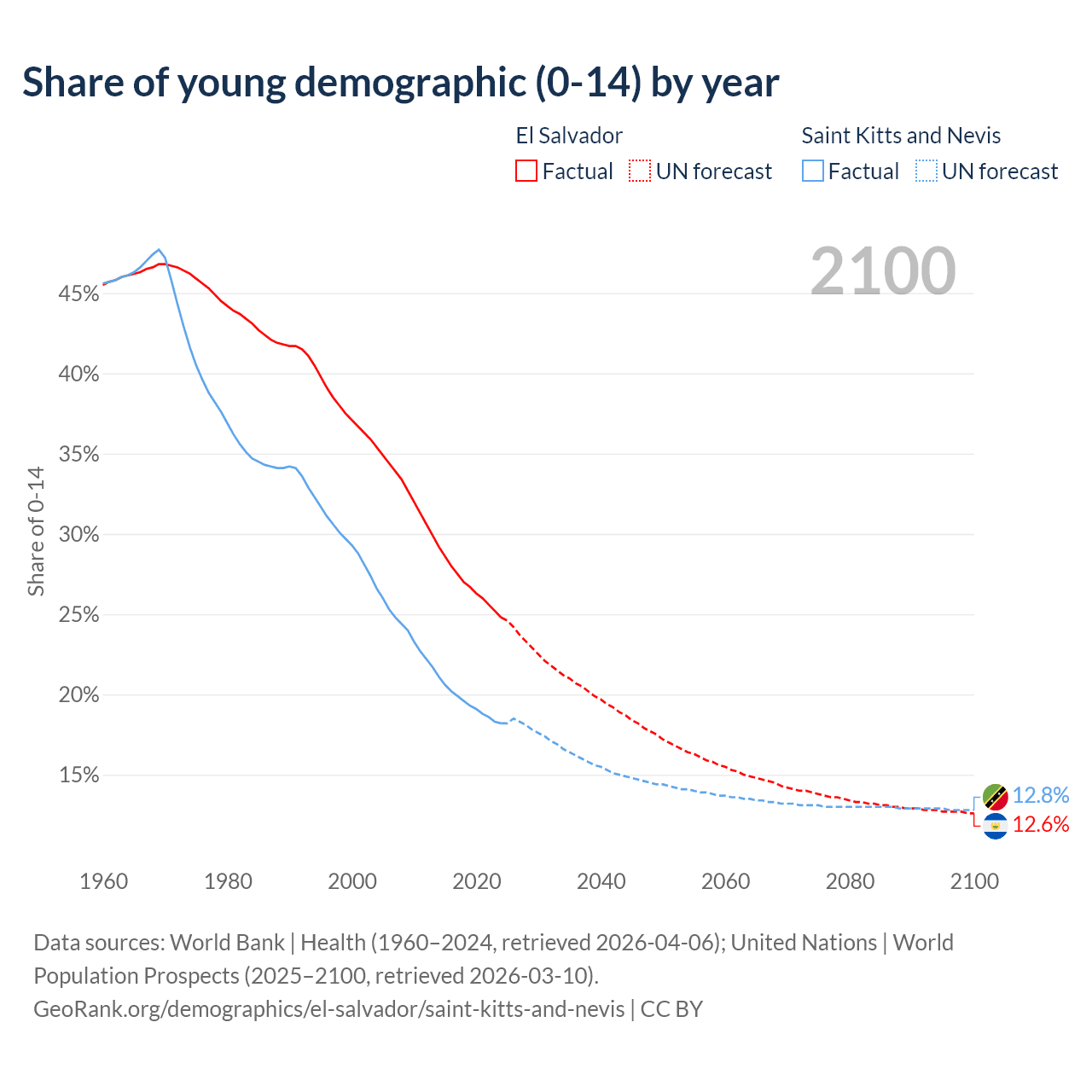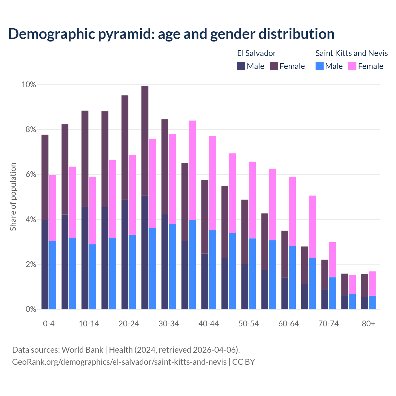 - The share of young demographic (0-15 years old) in El Salvador is 24.8% vs 18.2% in Saint Kitts and Nevis.