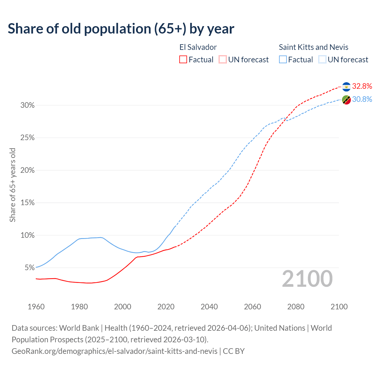 The share of older people aged 65 and over is 8.15% in El Salvador and 11.2% in Saint Kitts and Nevis. Life expectancy in El Salvador compared to Saint Kitts and Nevis .