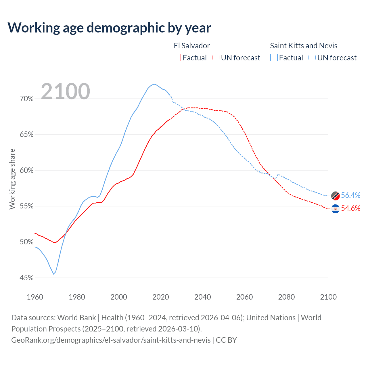 - El Salvador has 4.29M working age adults (aged 15-64) vs 33.2K in Saint Kitts and Nevis.