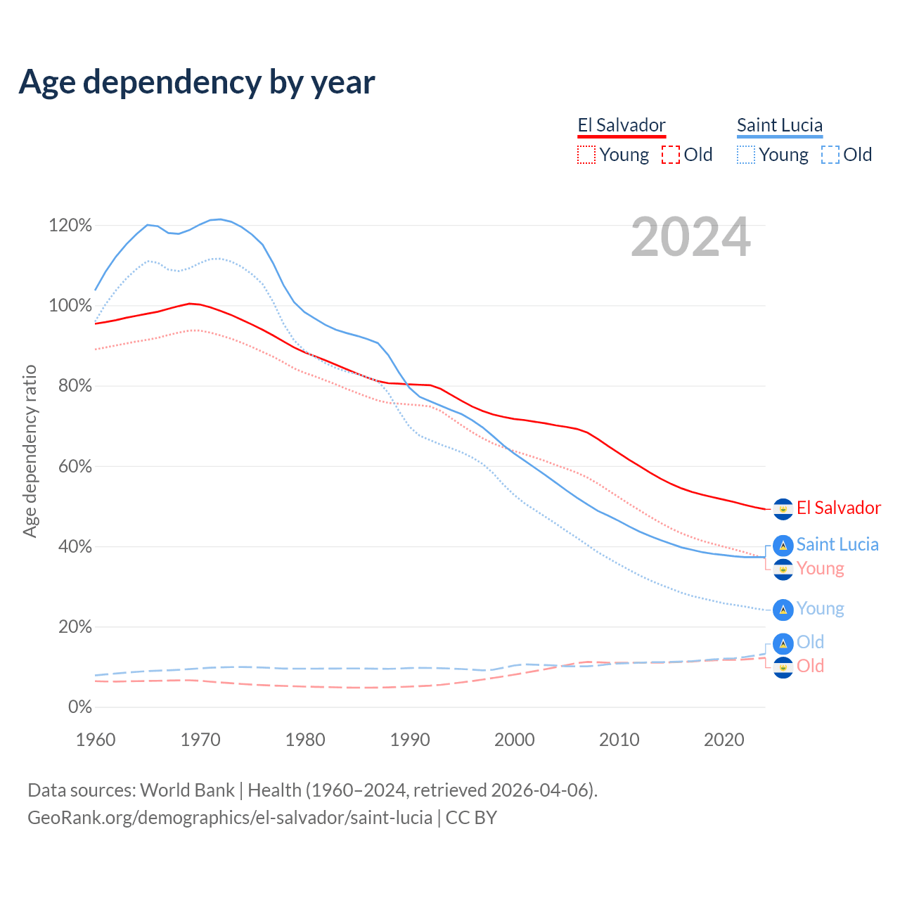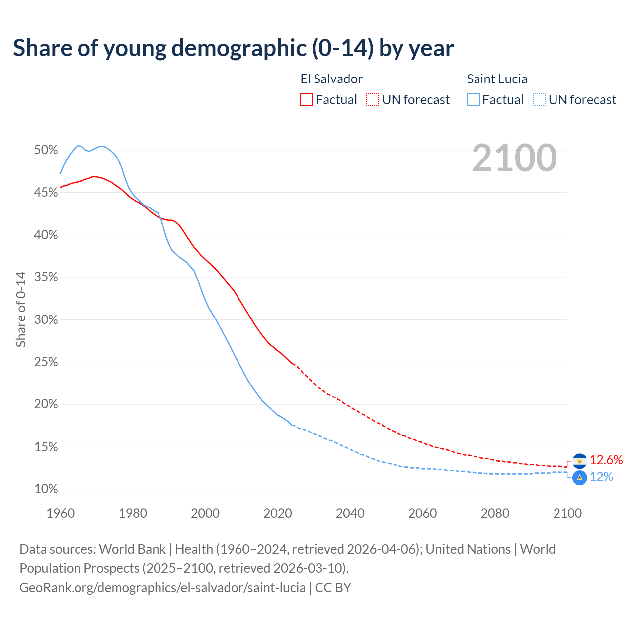 - The share of young demographic (0-15 years old) in El Salvador is 24.8% vs 17.5% in Saint Lucia.