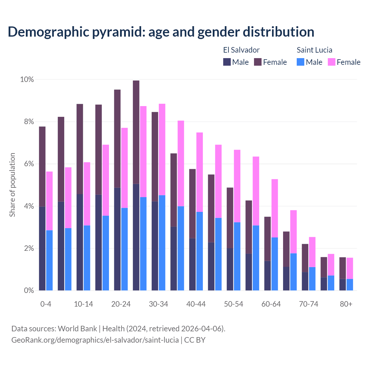 - The median age in El Salvador is 28.5 years compared to 35.2 years in Saint Lucia.
