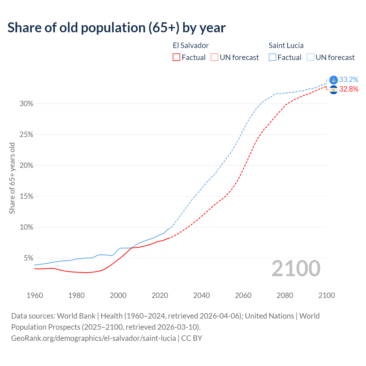 The share of older people aged 65 and over is 8.15% in El Salvador and 9.62% in Saint Lucia. Life expectancy in El Salvador compared to Saint Lucia .