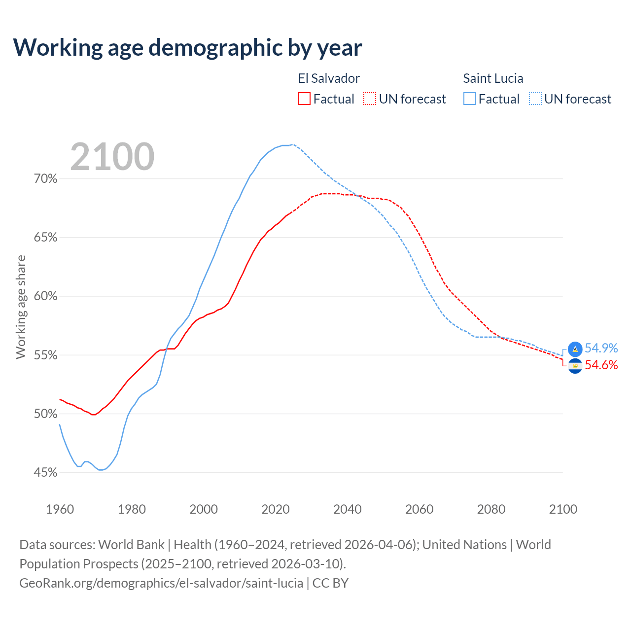 - El Salvador has 4.29M working age adults (aged 15-64) vs 132K in Saint Lucia.