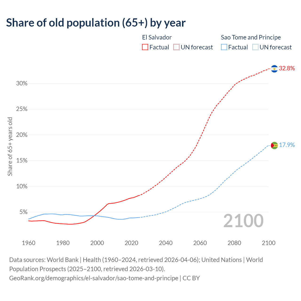 The share of older people aged 65 and over is 8.15% in El Salvador and 3.9% in Sao Tome and Principe. Life expectancy in El Salvador compared to Sao Tome and Principe .