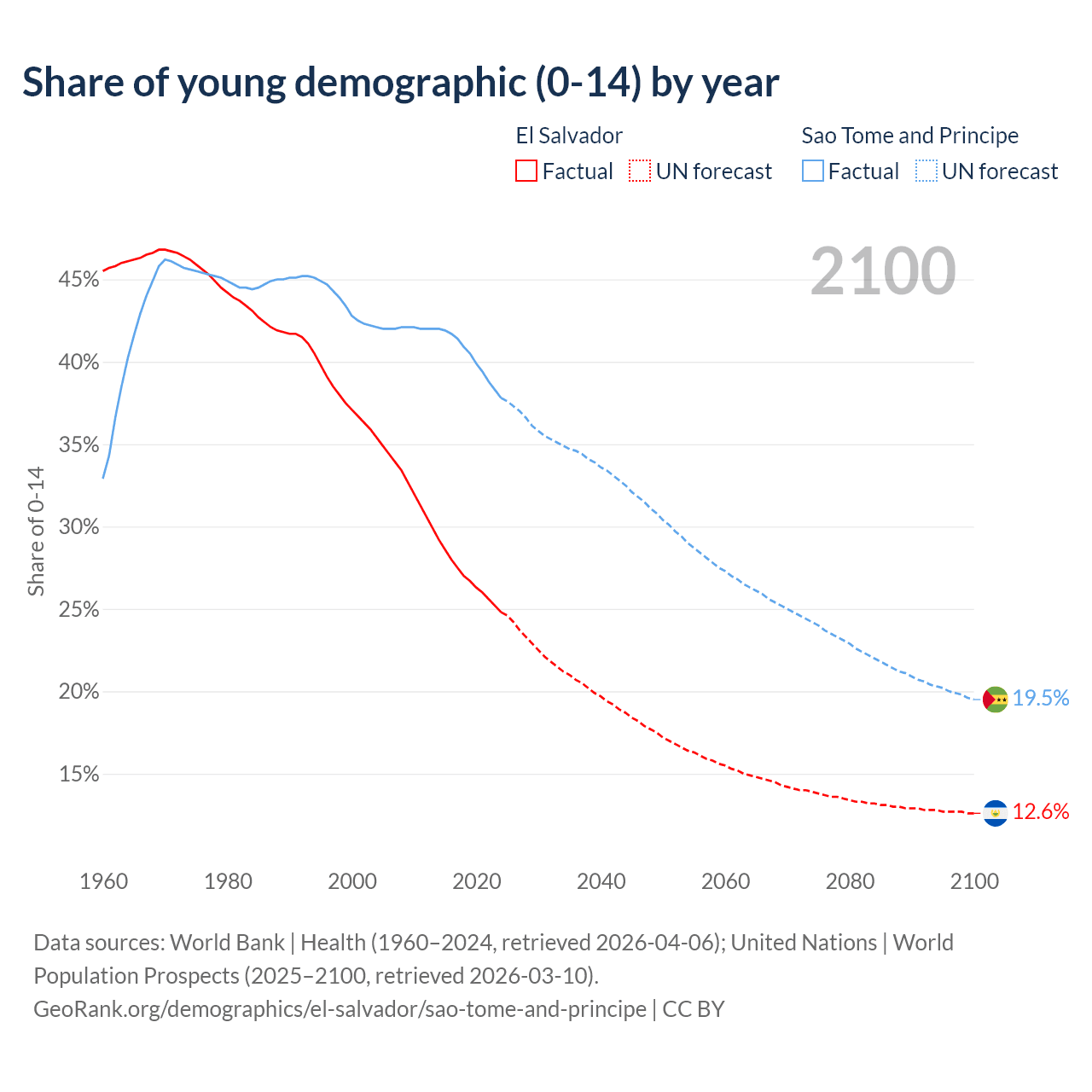 - The share of young demographic (0-15 years old) in El Salvador is 24.8% vs 37.8% in Sao Tome and Principe.