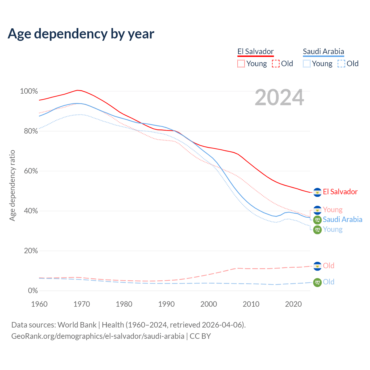 - The share of old-age demographic (65+) in El Salvador is 8.15% vs 2.95% in Saudi Arabia.
