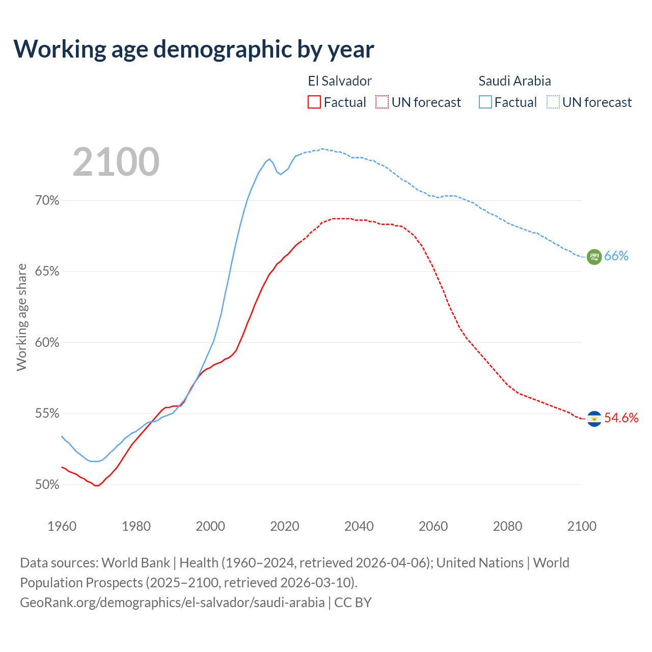 - El Salvador has 4.29M working age adults (aged 15-64) vs 26.9M in Saudi Arabia.
