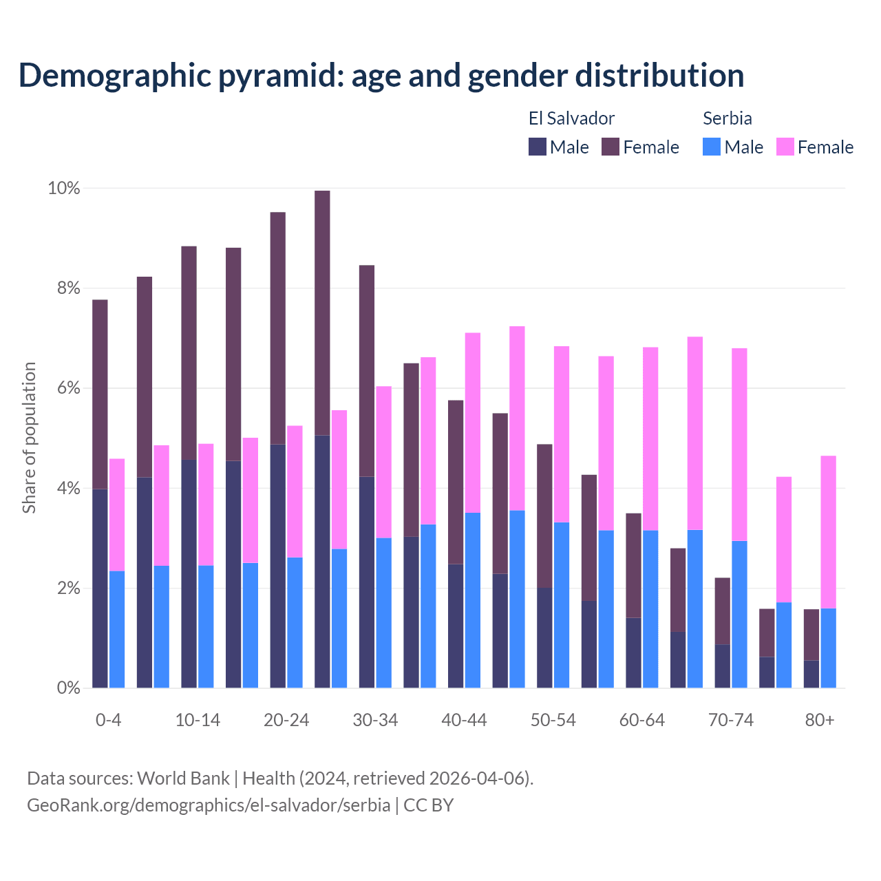 - El Salvador is ranked 115/196 by median age (oldest to youngest) vs 15/196 for Serbia.