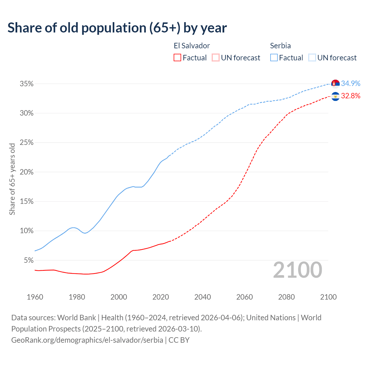 The share of older people aged 65 and over is 8.15% in El Salvador and 22.7% in Serbia. Life expectancy in El Salvador compared to Serbia .