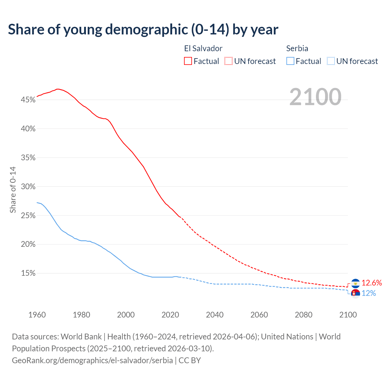 - The share of young demographic (0-15 years old) in El Salvador is 24.8% vs 14.3% in Serbia.