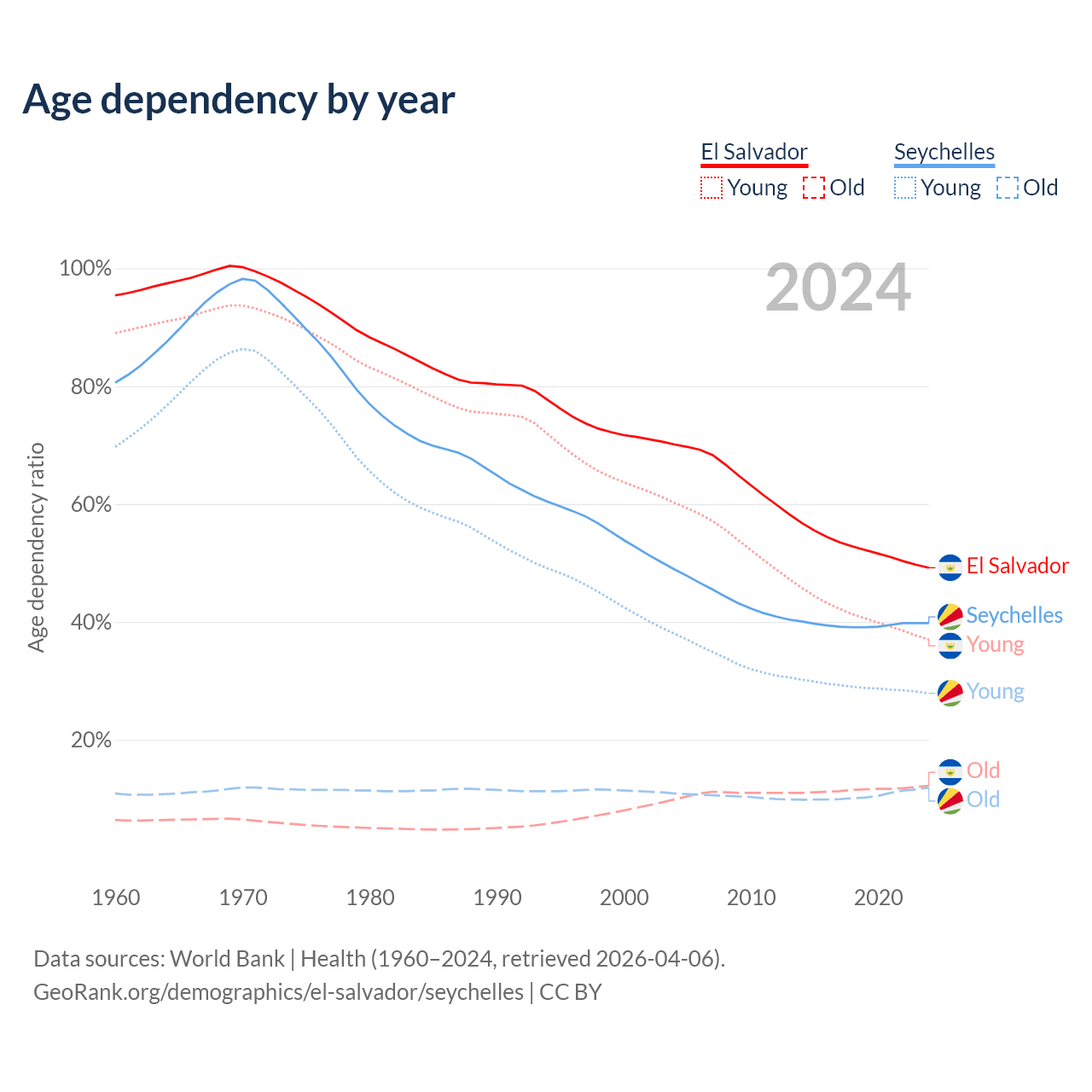 - The share of young demographic (0-15 years old) in El Salvador is 24.8% vs 20% in the Seychelles.