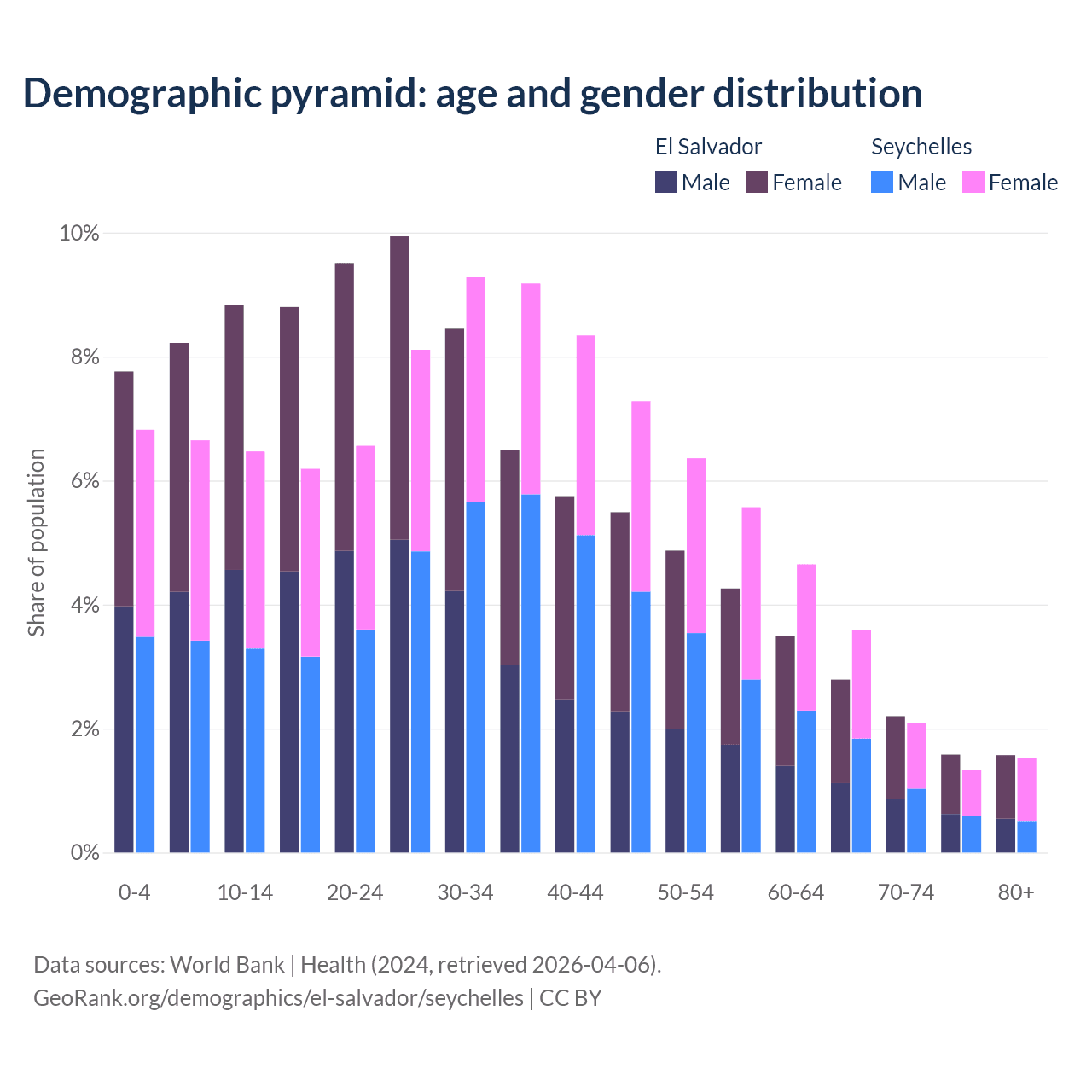 - As of 2026, the population of El Salvador is 6.4M vs 126K in the Seychelles - 50.7 times difference.
