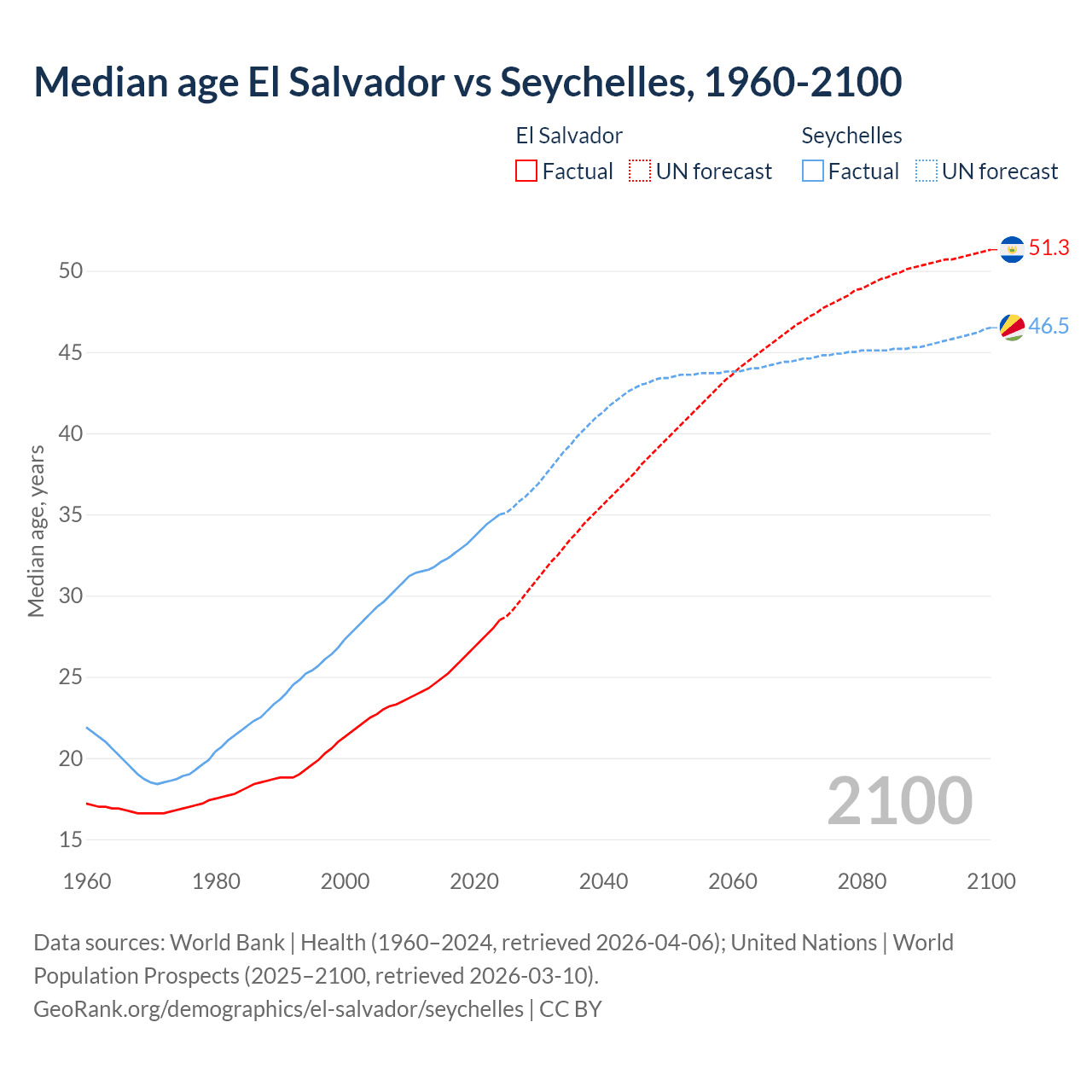 - El Salvador is ranked 115/196 by median age (oldest to youngest) vs 76/196 for the Seychelles.