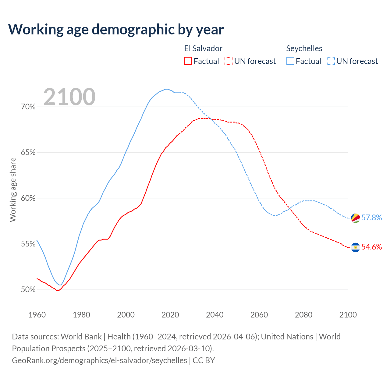 - El Salvador has 4.29M working age adults (aged 15-64) vs 90.3K in the Seychelles.