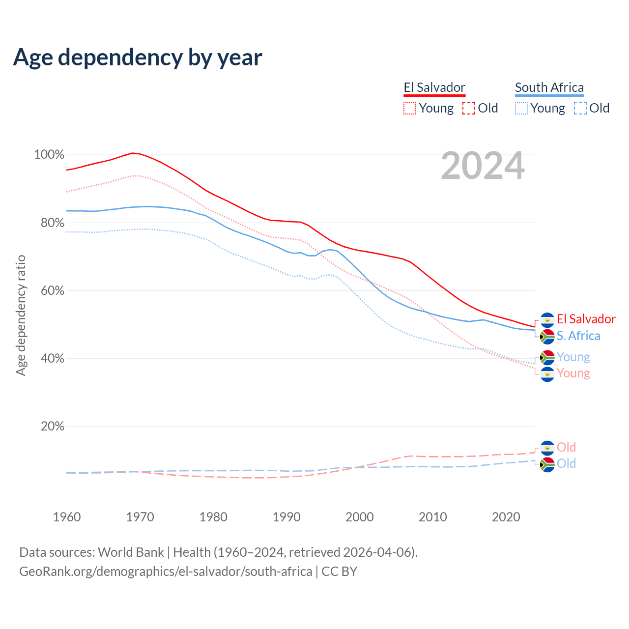 Data sources: World Bank | Health (1960–2024, retrieved 2026-04-06); U.S. Census Bureau (1960–2024, retrieved 2026-02-08).