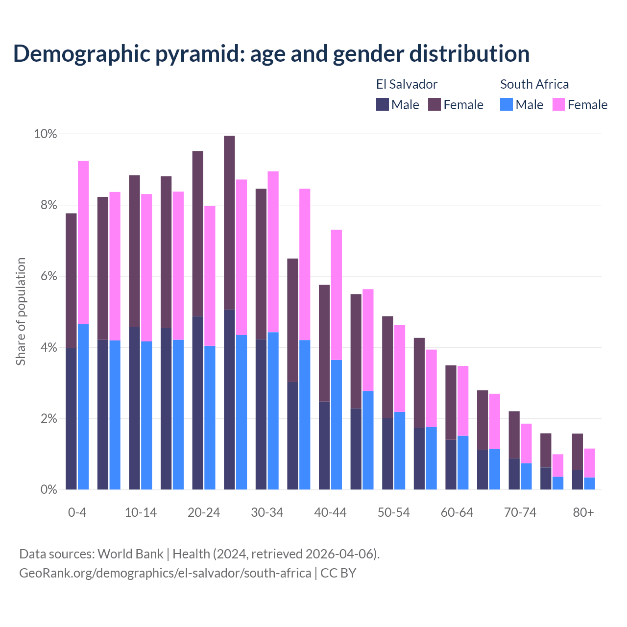- El Salvador is ranked 115/196 by median age (oldest to youngest) vs 107/196 for South Africa.