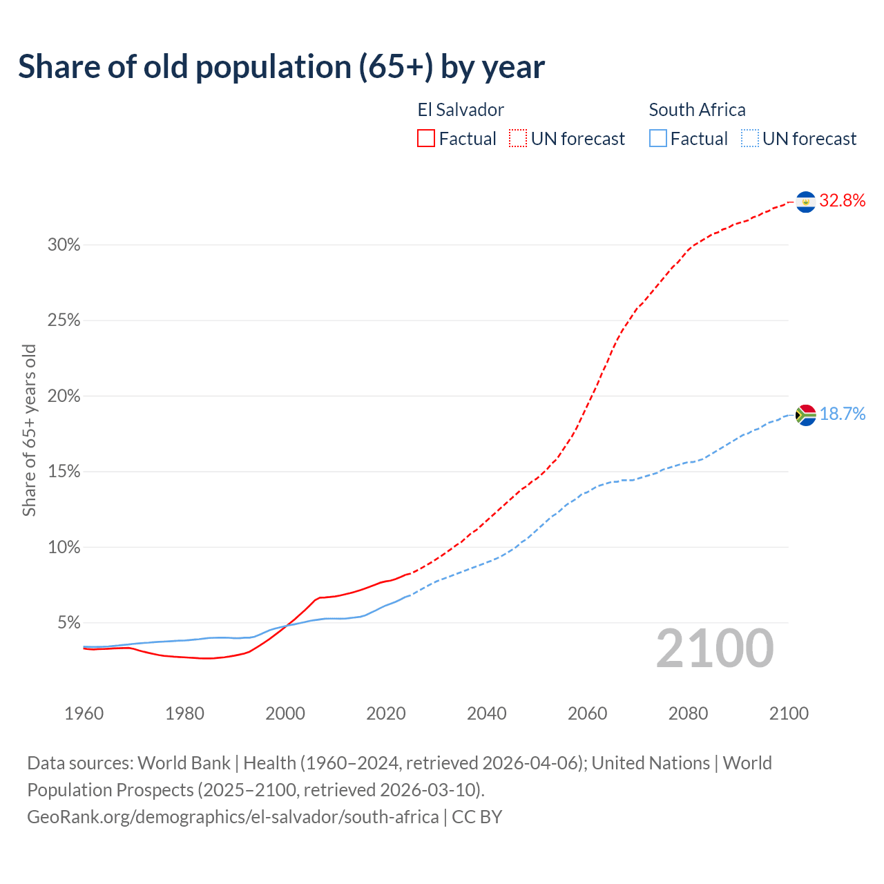 The share of older people aged 65 and over is 8.15% in El Salvador and 6.69% in South Africa. Life expectancy in El Salvador compared to South Africa .