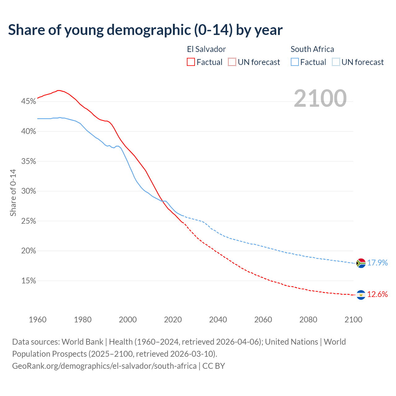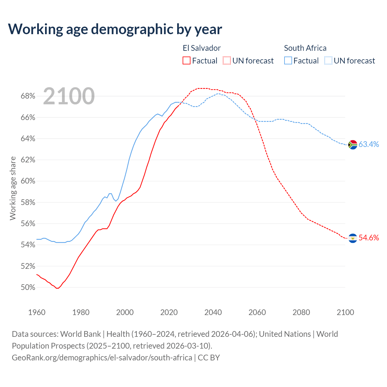 Median age El Salvador vs South Africa, 1960-2100