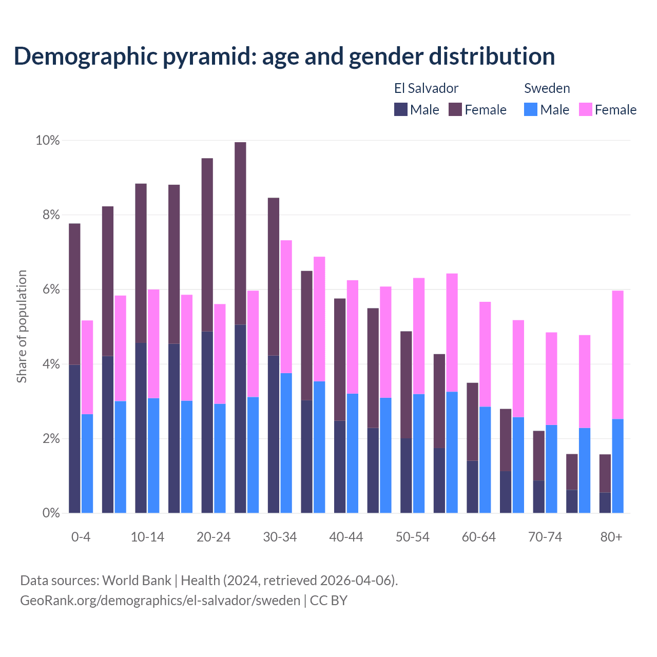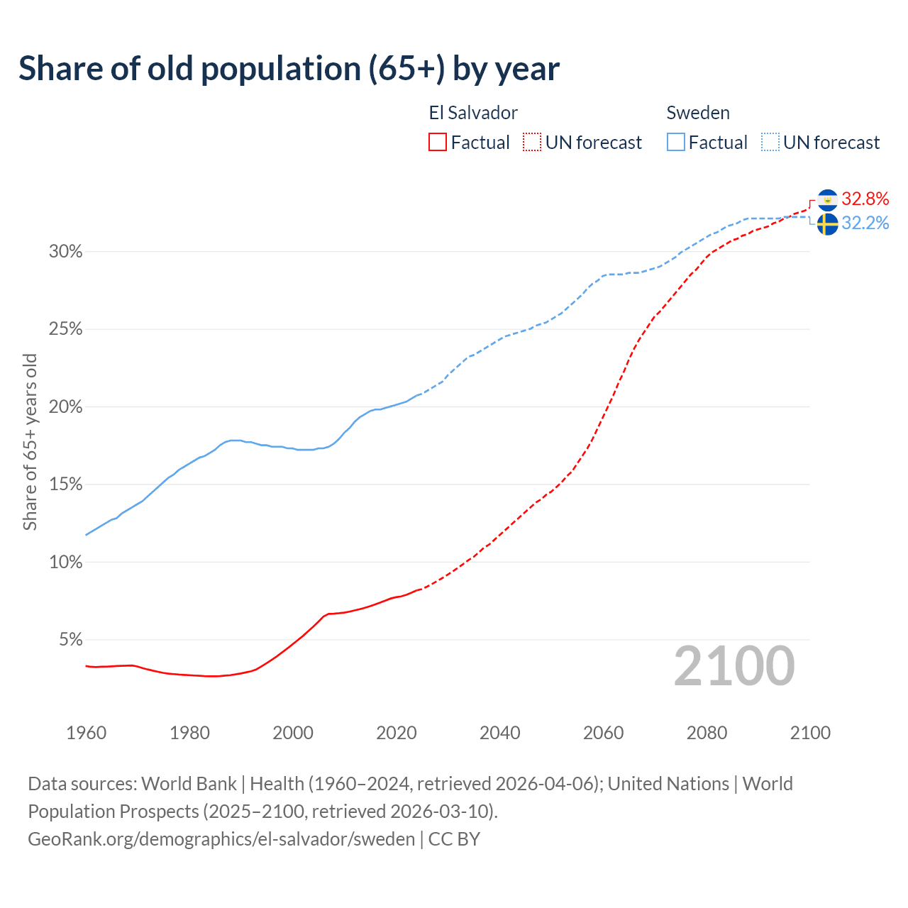 - The share of old-age demographic (65+) in El Salvador is 8.15% vs 20.7% in Sweden.