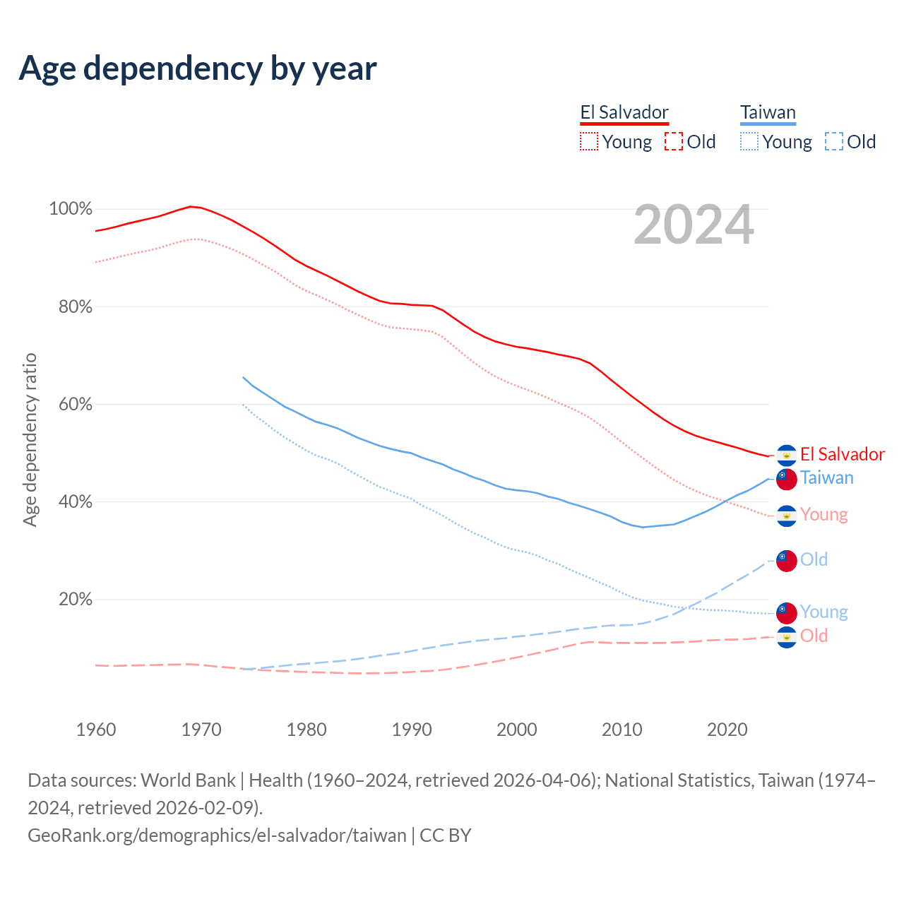 Data sources: World Bank | Health (1960–2024, retrieved 2026-04-06); U.S. Census Bureau (1960–2024, retrieved 2026-02-08); National Statistics, Taiwan (1974–2024, retrieved 2026-02-09).