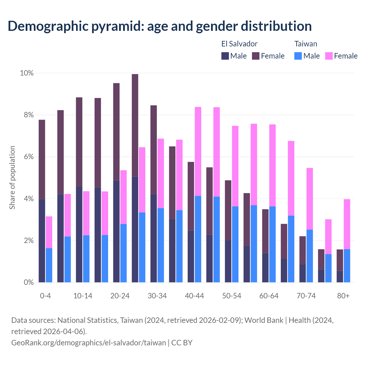 - El Salvador is ranked 115/196 by median age (oldest to youngest) vs 16/196 for Taiwan.