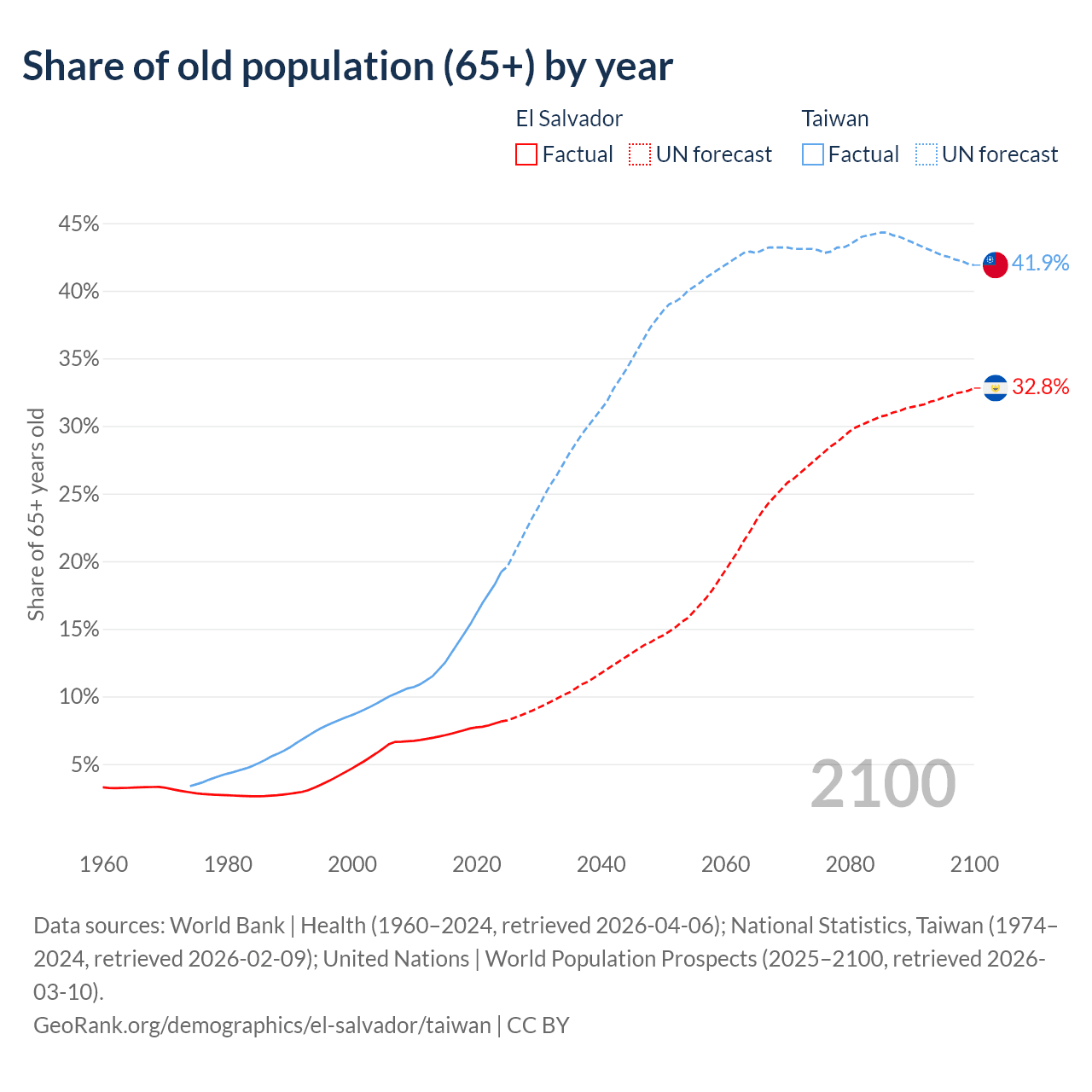 The share of older people aged 65 and over is 8.15% in El Salvador and 19.2% in Taiwan. Life expectancy in El Salvador compared to Taiwan .