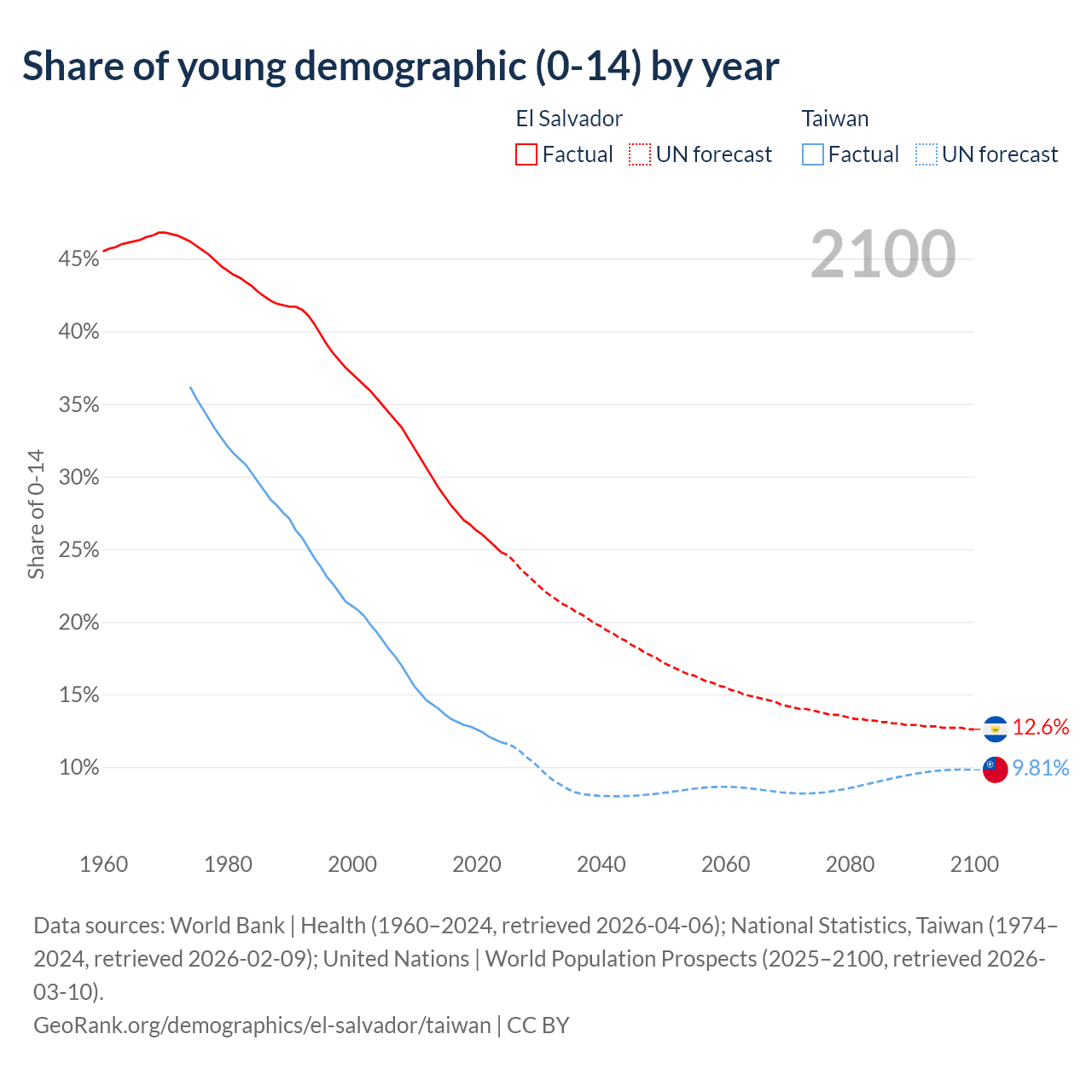 - The share of young demographic (0-15 years old) in El Salvador is 24.8% vs 11.7% in Taiwan.