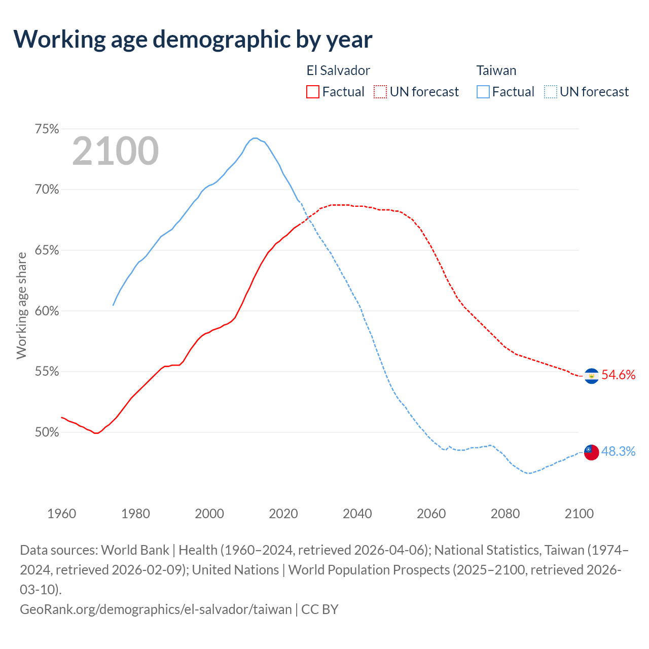 - El Salvador has 4.29M working age adults (aged 15-64) vs 16.1M in Taiwan.