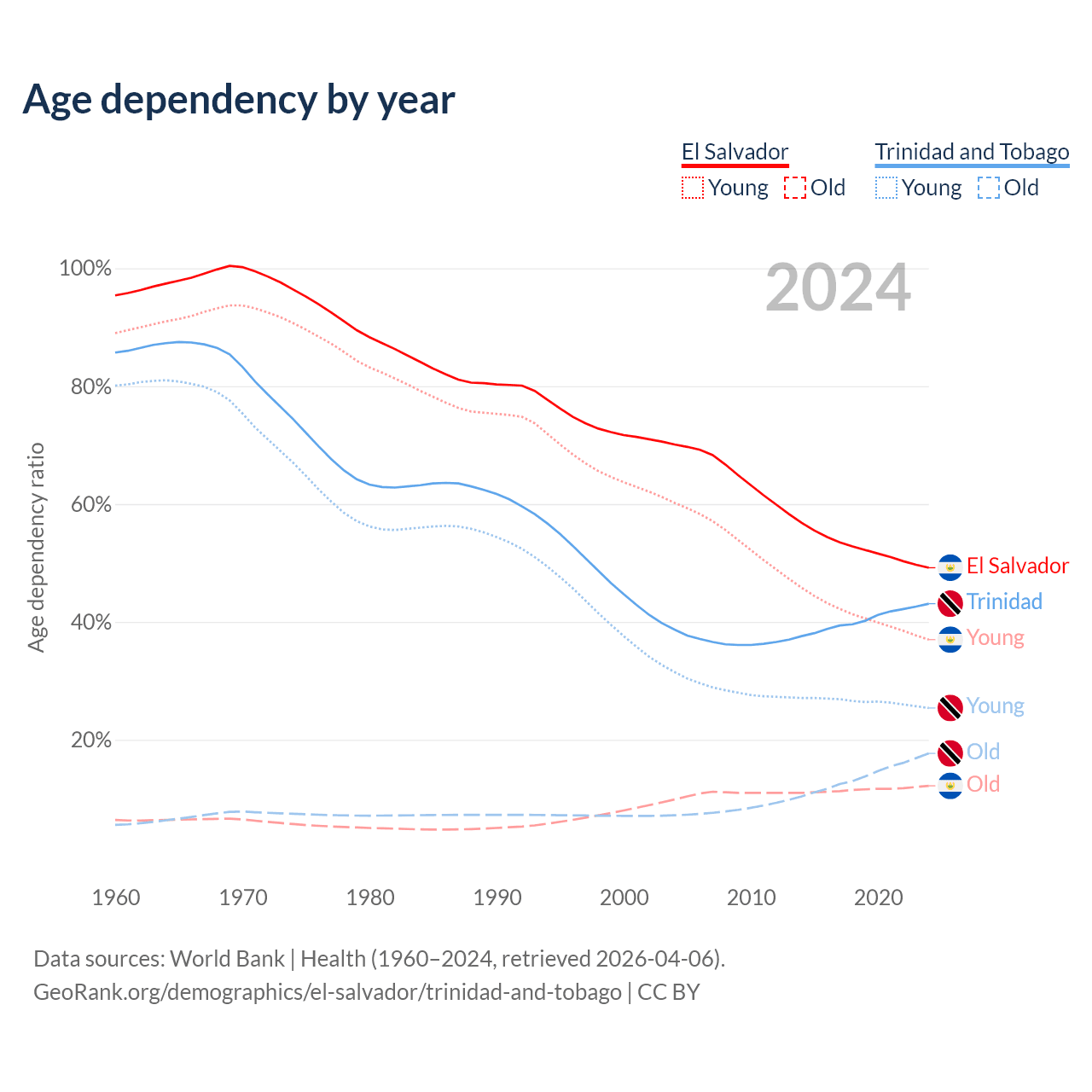 - El Salvador is ranked 115/196 by median age (oldest to youngest) vs 58/196 for Trinidad and Tobago.