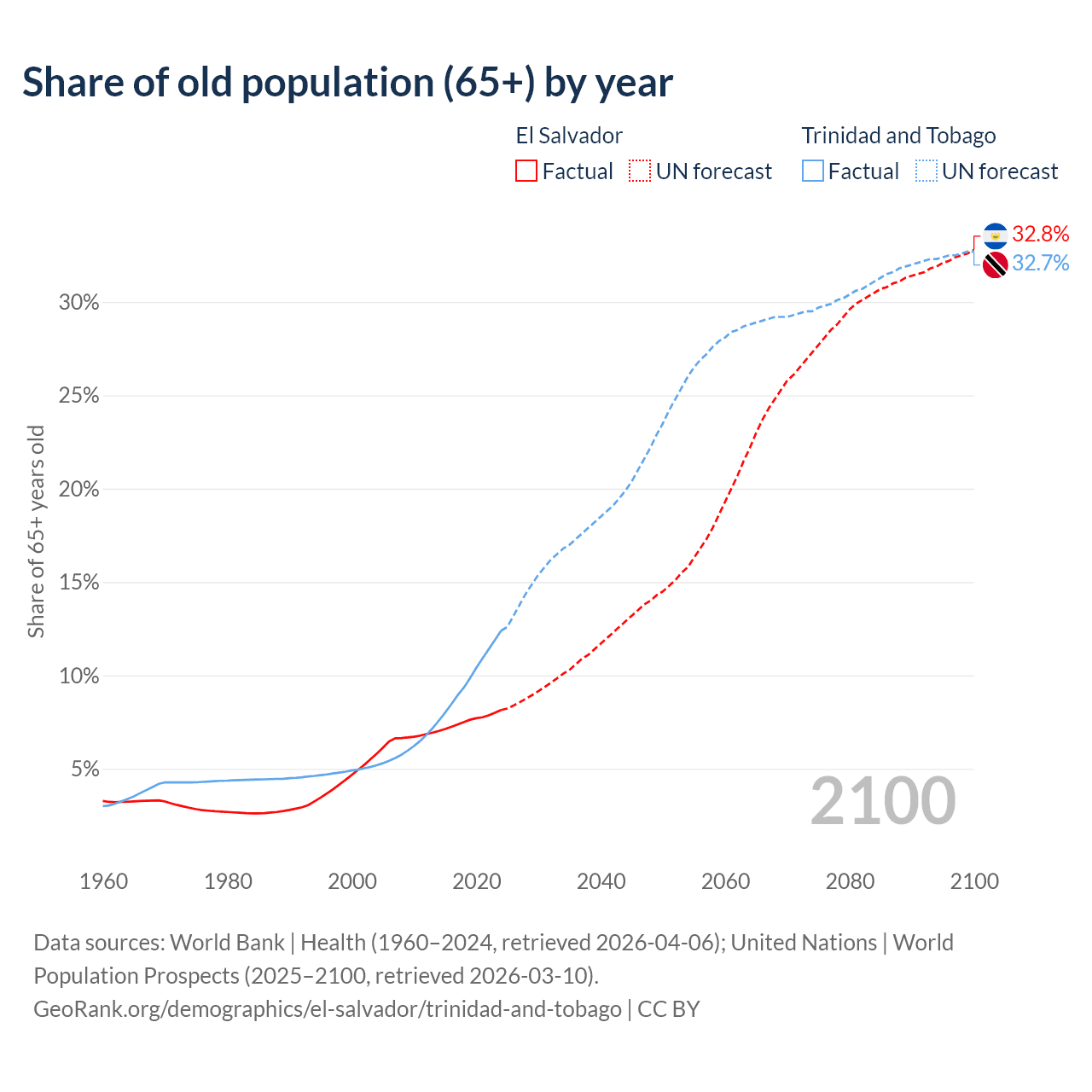 The share of older people aged 65 and over is 8.15% in El Salvador and 12.4% in Trinidad and Tobago. Life expectancy in El Salvador compared to Trinidad and Tobago .