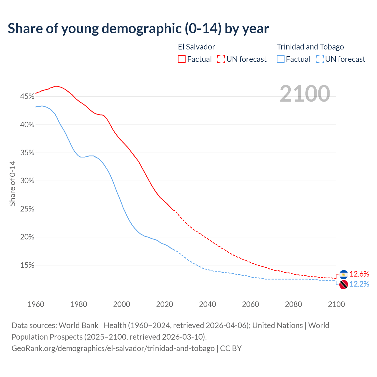 - The share of young demographic (0-15 years old) in El Salvador is 24.8% vs 17.8% in Trinidad and Tobago.