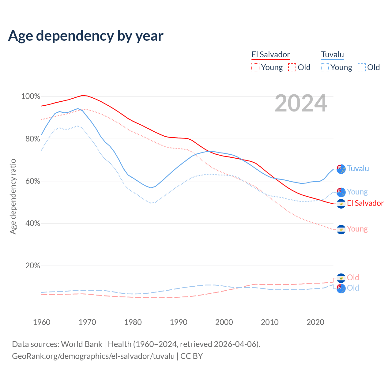 - The share of young demographic (0-15 years old) in El Salvador is 24.8% vs 32.9% in Tuvalu.