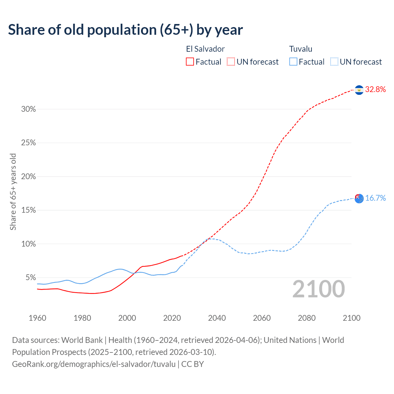 - The share of old-age demographic (65+) in El Salvador is 8.15% vs 6.67% in Tuvalu.