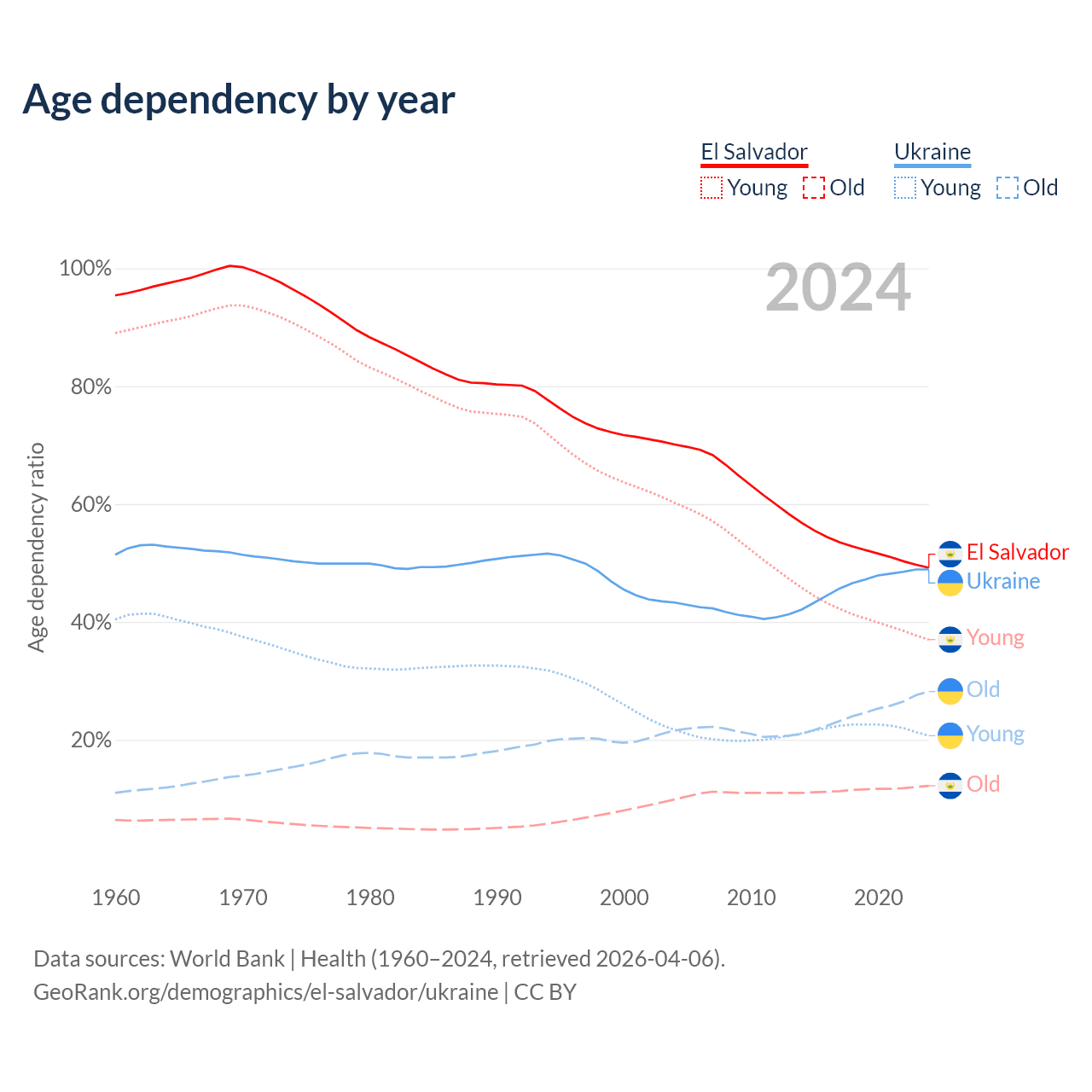 - El Salvador is ranked 115/196 by median age (oldest to youngest) vs 26/196 for Ukraine.