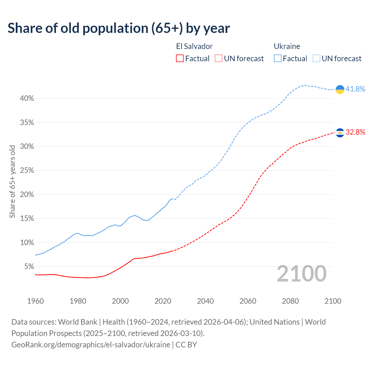 The share of older people aged 65 and over is 8.15% in El Salvador and 19% in Ukraine. Life expectancy in El Salvador compared to Ukraine .