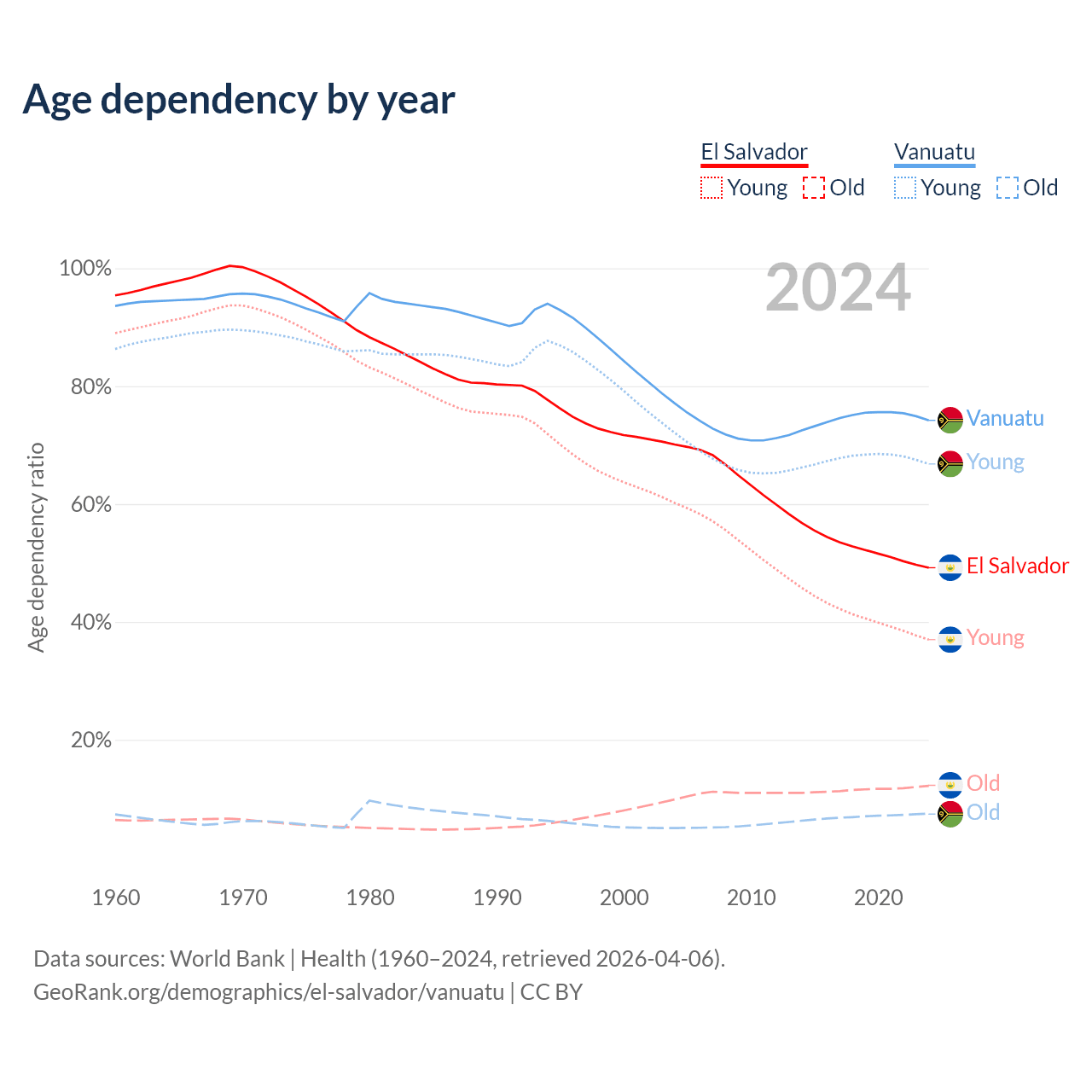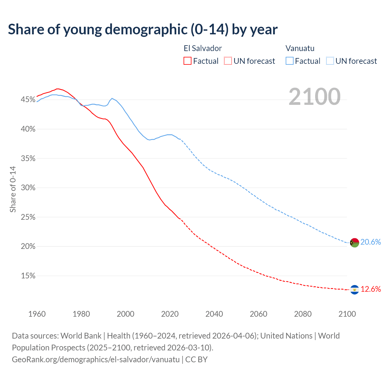 - The share of young demographic (0-15 years old) in El Salvador is 24.8% vs 38.3% in Vanuatu.