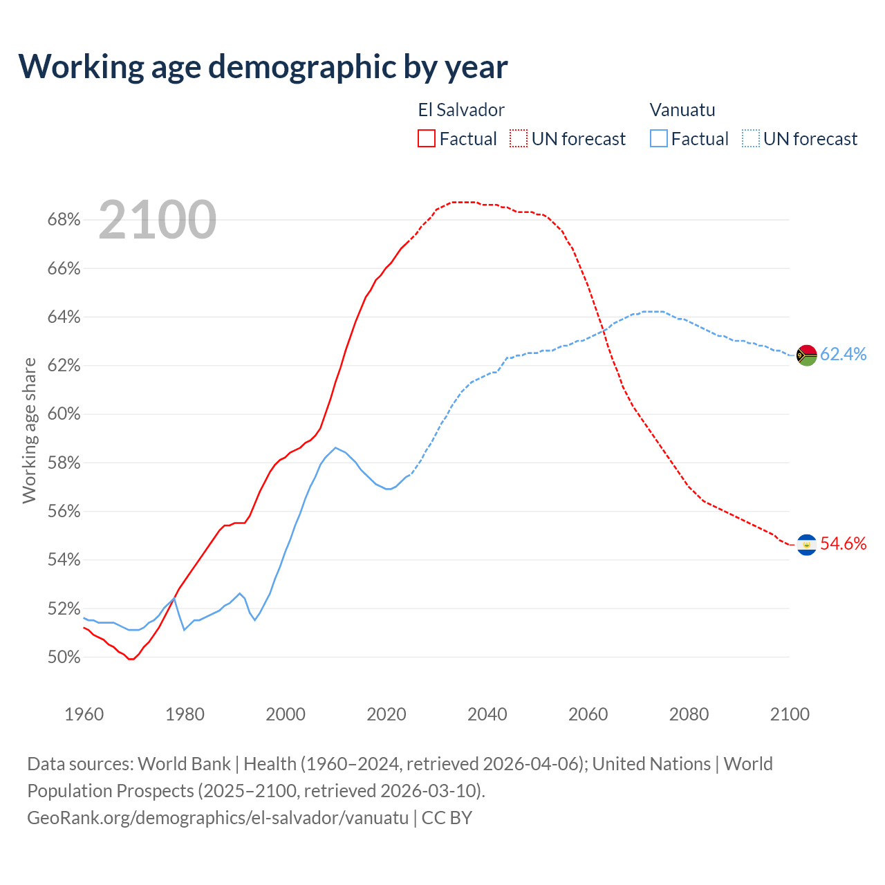 Median age El Salvador vs Vanuatu, 1960-2100