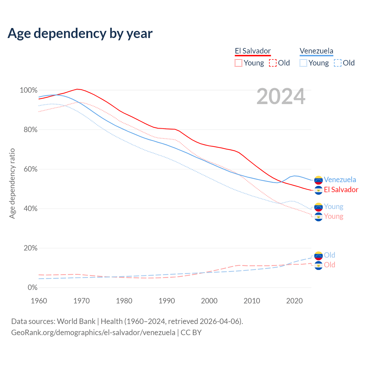 Data sources: World Bank | Health (1960–2024, retrieved 2026-04-06); U.S. Census Bureau (1960–2024, retrieved 2026-02-08).