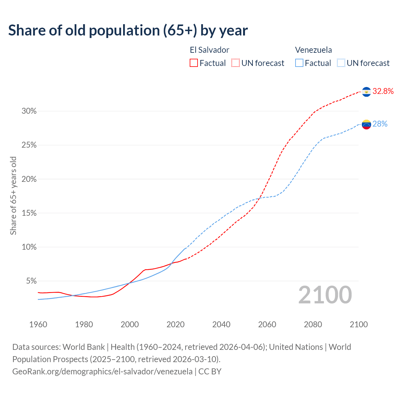 The share of older people aged 65 and over is 8.15% in El Salvador and 9.68% in Venezuela. Life expectancy in El Salvador compared to Venezuela .