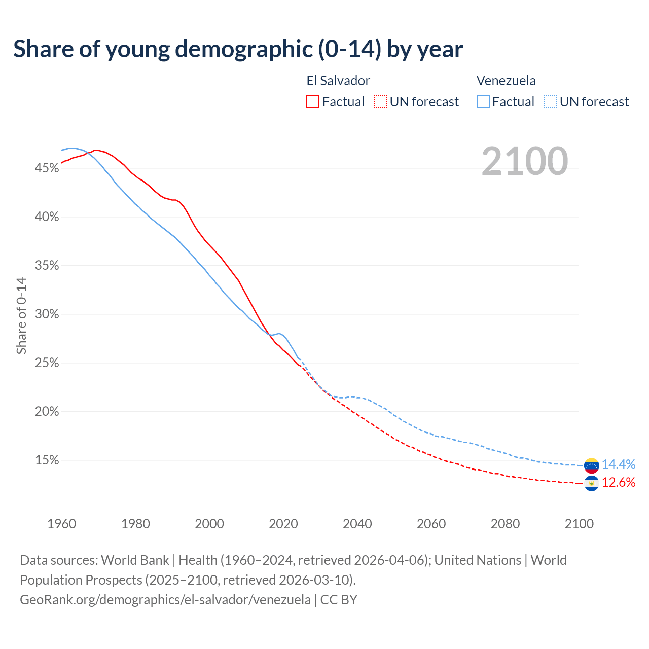 - The share of young demographic (0-15 years old) in El Salvador is 24.8% vs 25.5% in Venezuela.
