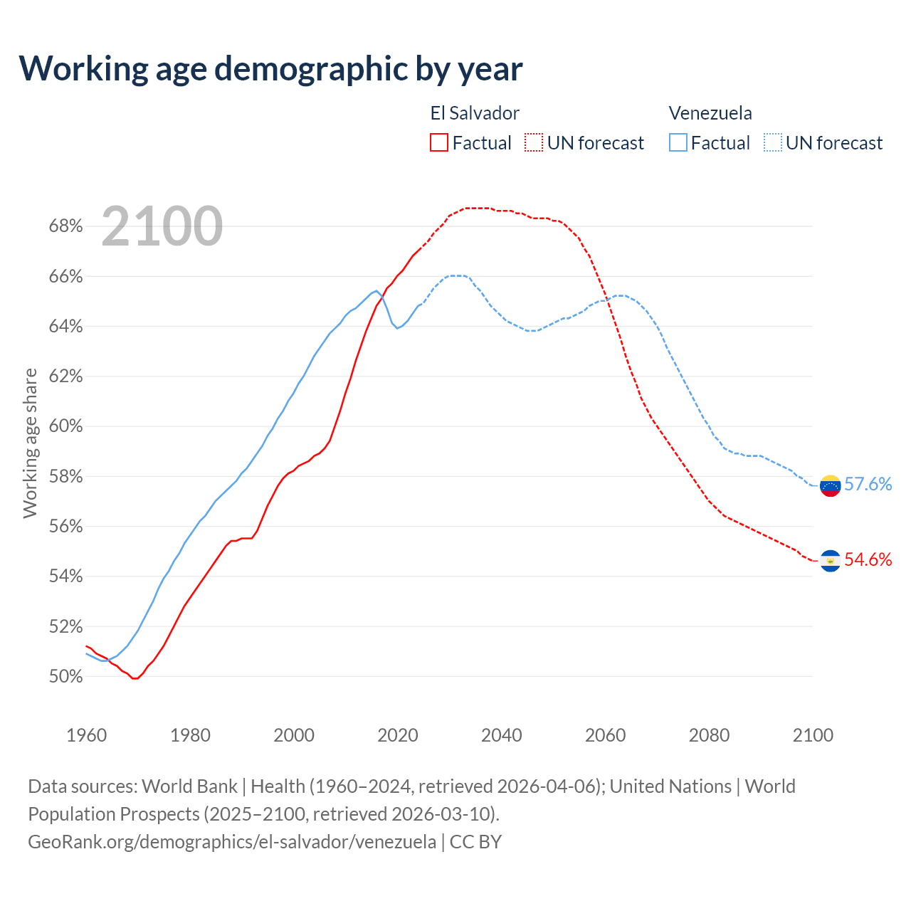 Median age El Salvador vs Venezuela, 1960-2100