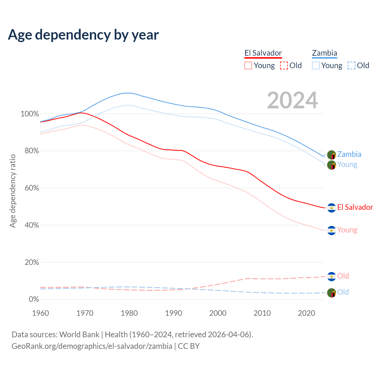 - The share of old-age demographic (65+) in El Salvador is 8.15% vs 1.95% in Zambia.