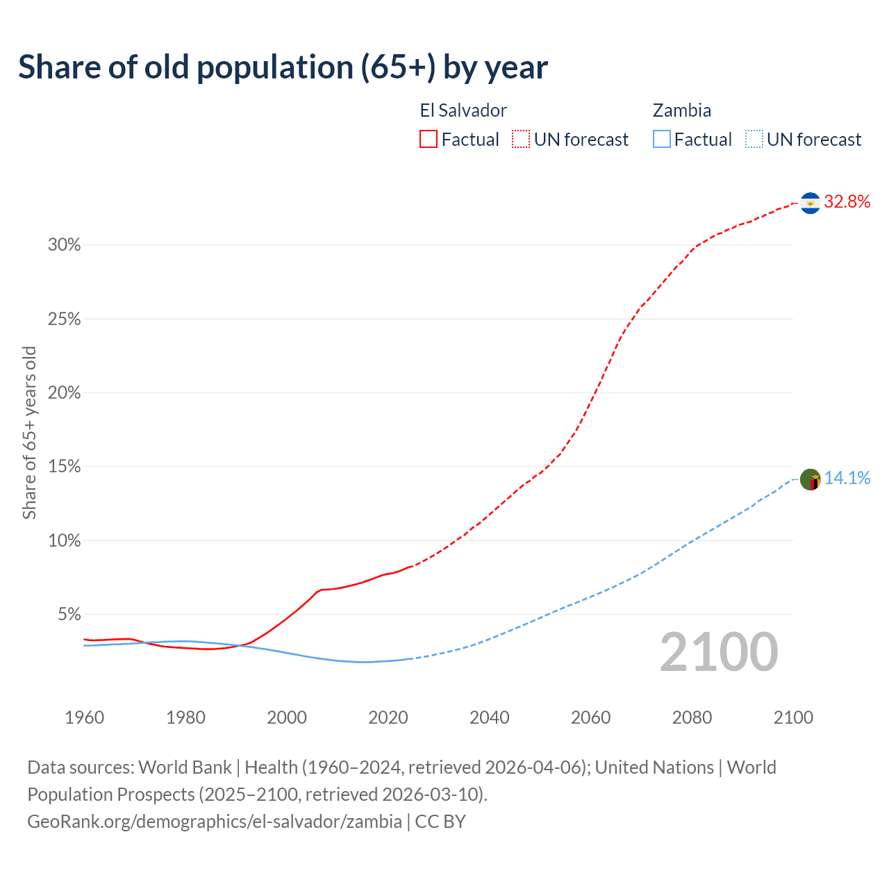 The share of older people aged 65 and over is 8.15% in El Salvador and 1.95% in Zambia. Life expectancy in El Salvador compared to Zambia .
