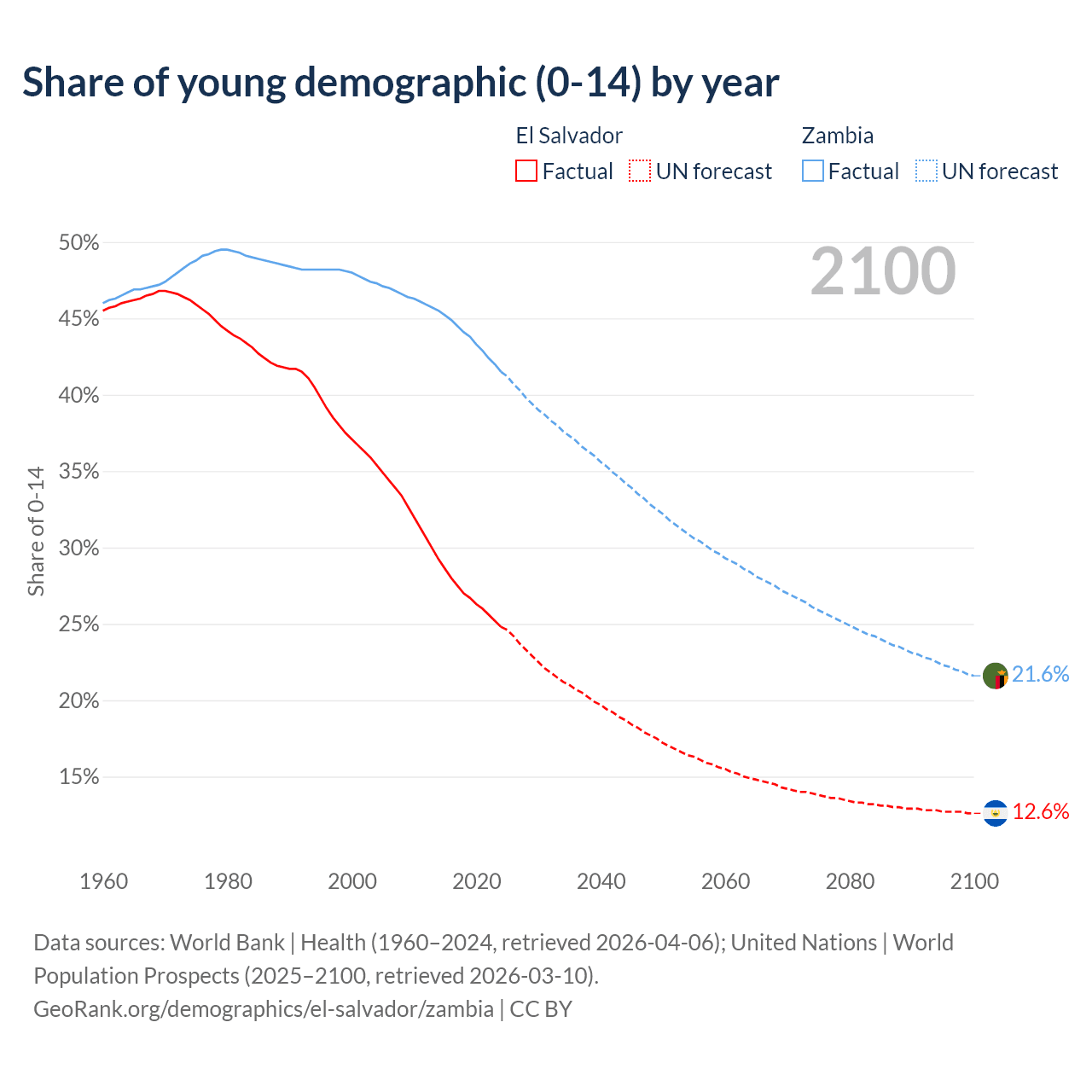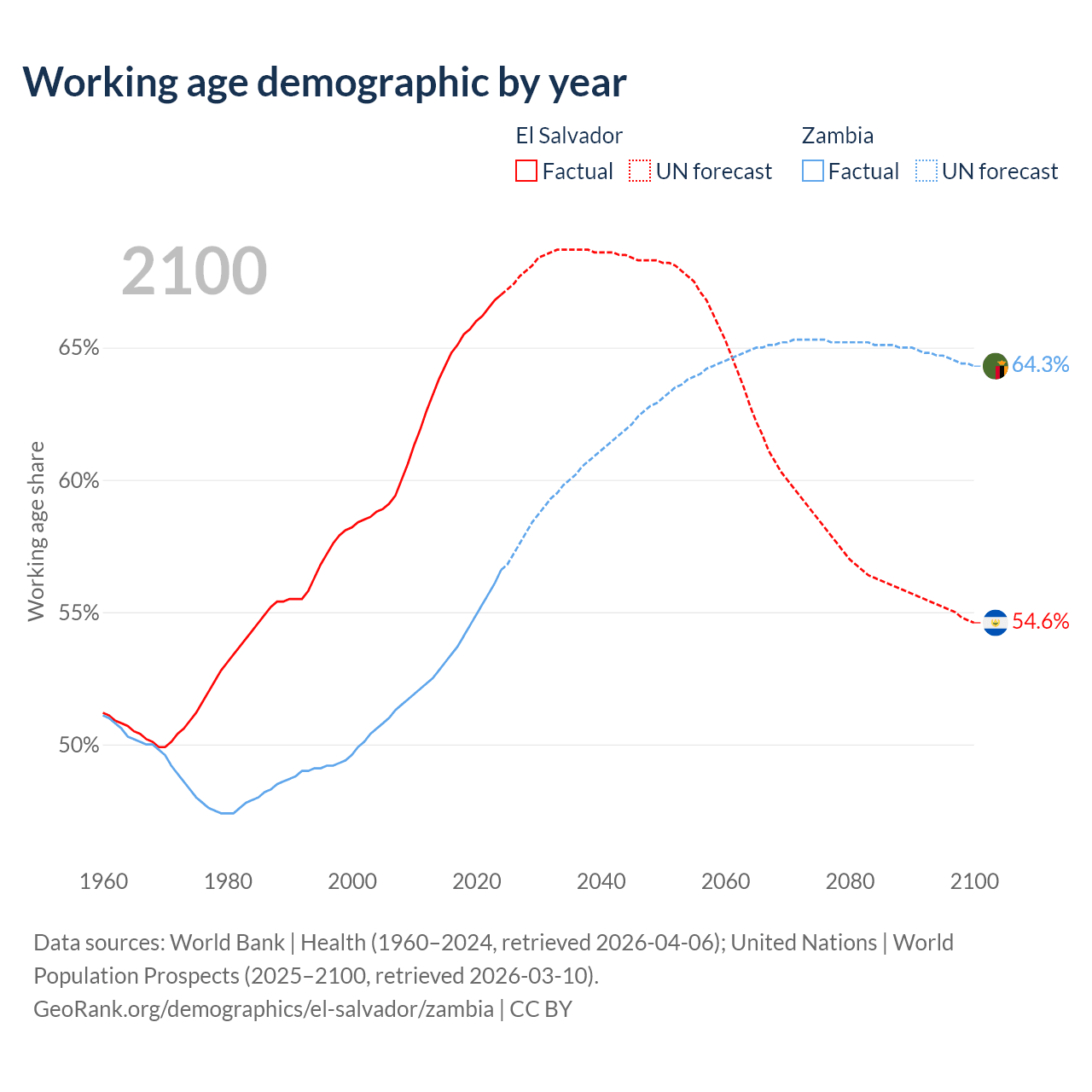 Median age El Salvador vs Zambia, 1960-2100