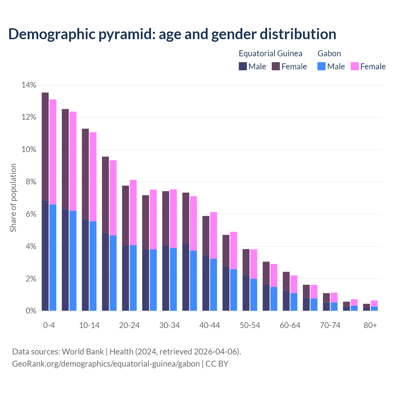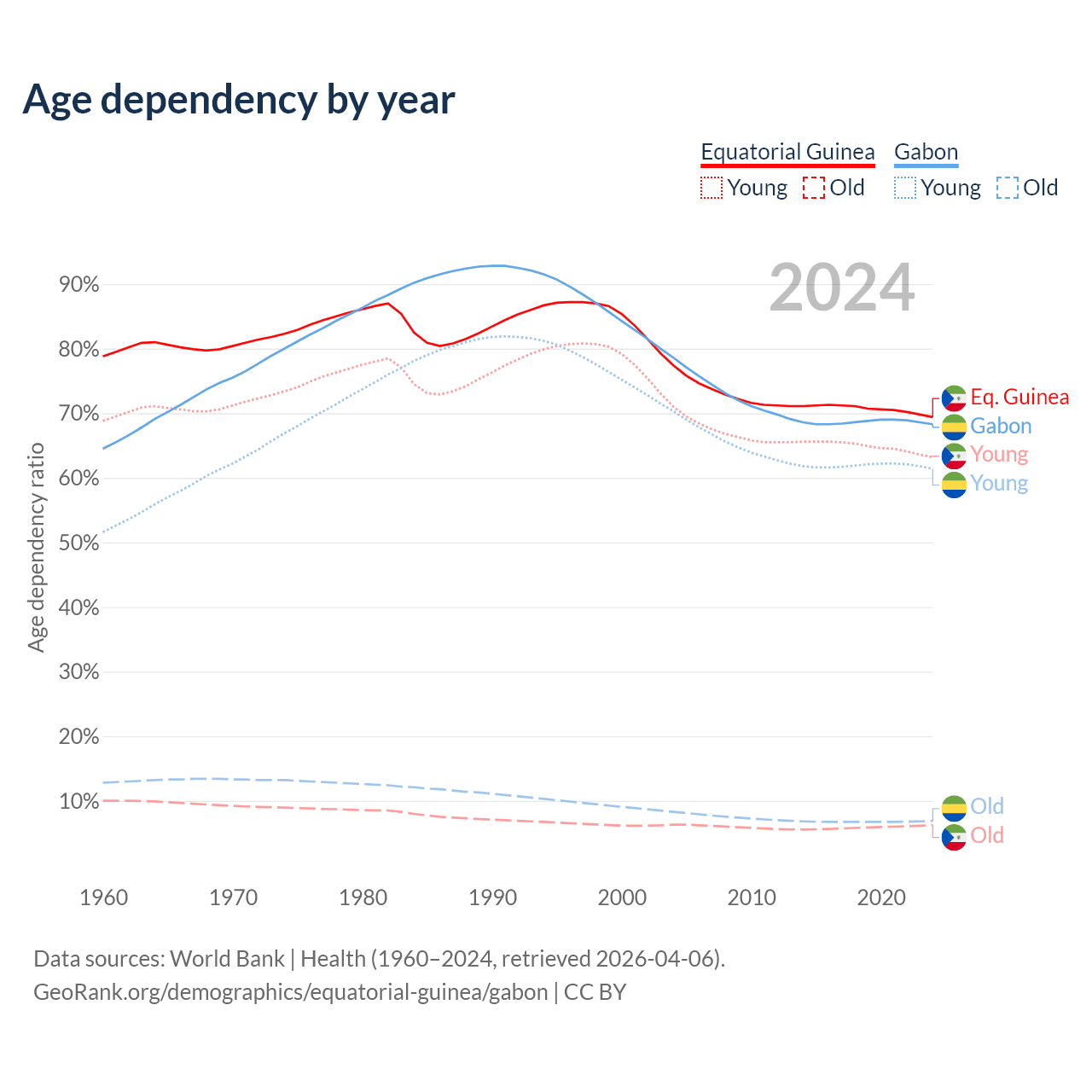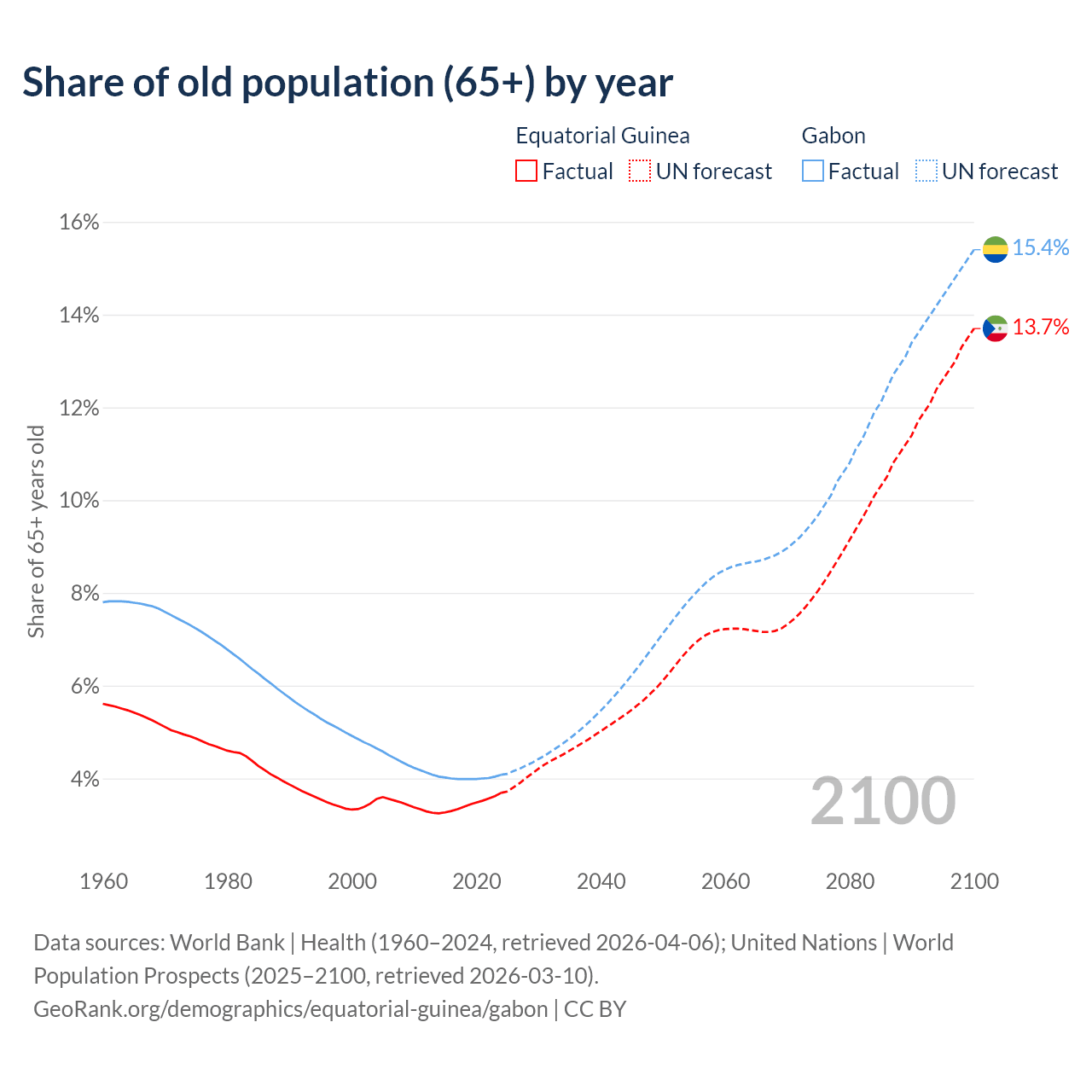 The share of older people aged 65 and over is 3.69% in Equatorial Guinea and 4.08% in Gabon. Life expectancy in Equatorial Guinea compared to Gabon .