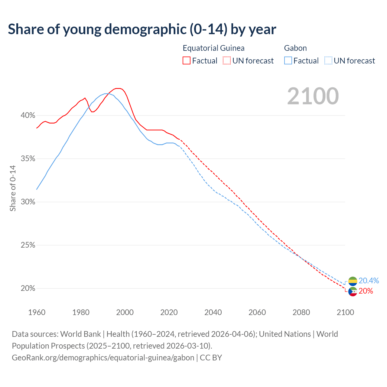 Median age Equatorial Guinea vs Gabon, 1960-2100