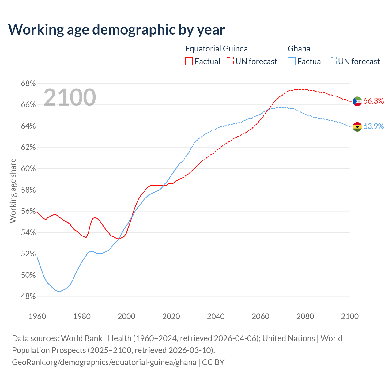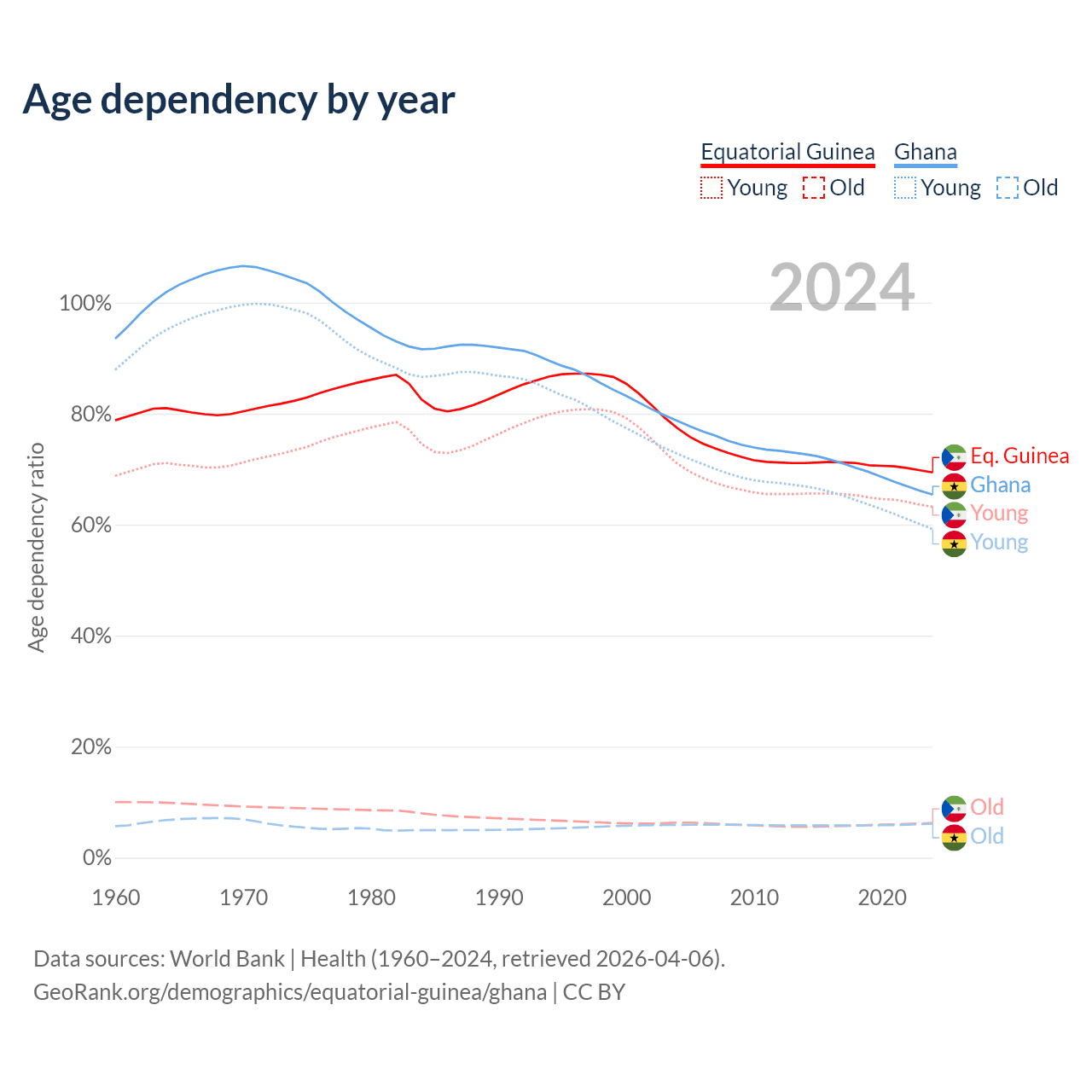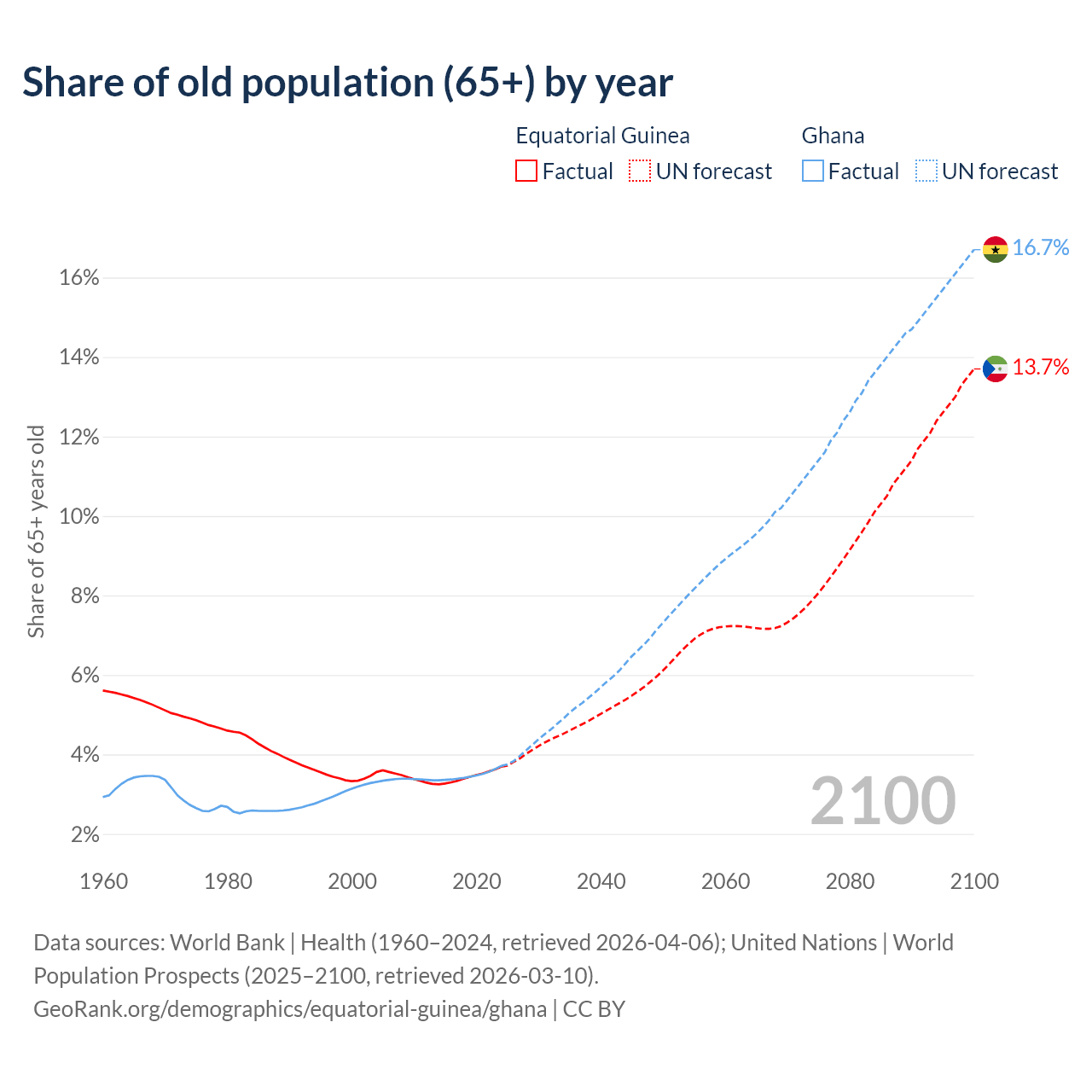 - The share of old-age demographic (65+) in Equatorial Guinea is 3.69% vs 3.71% in Ghana.