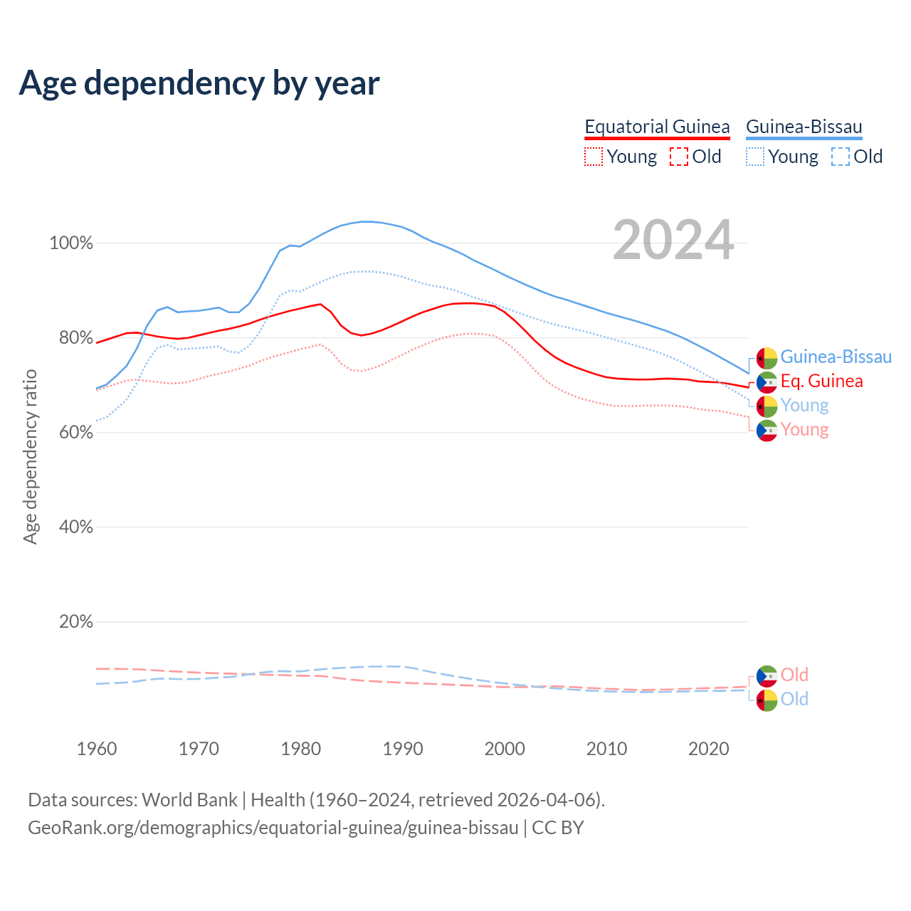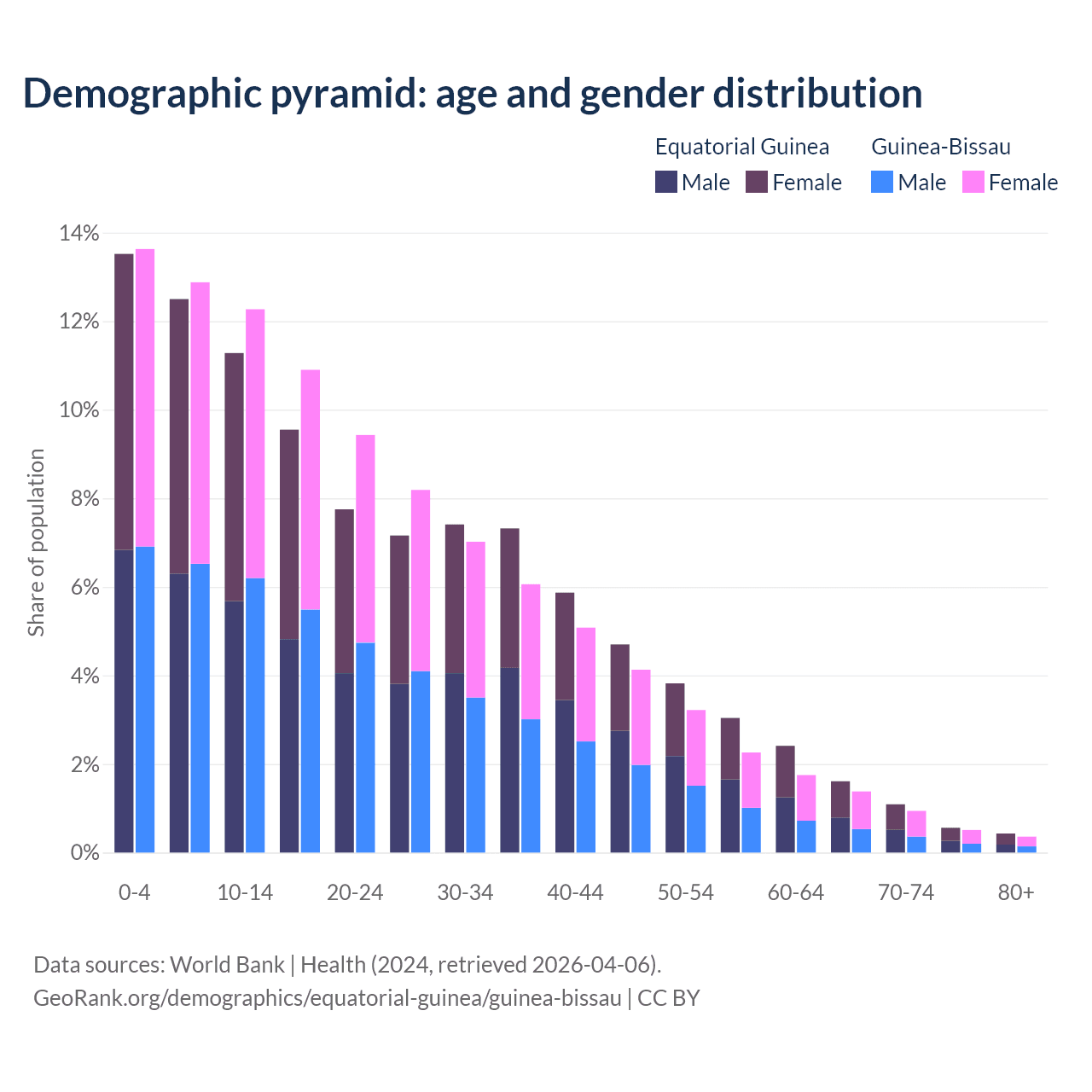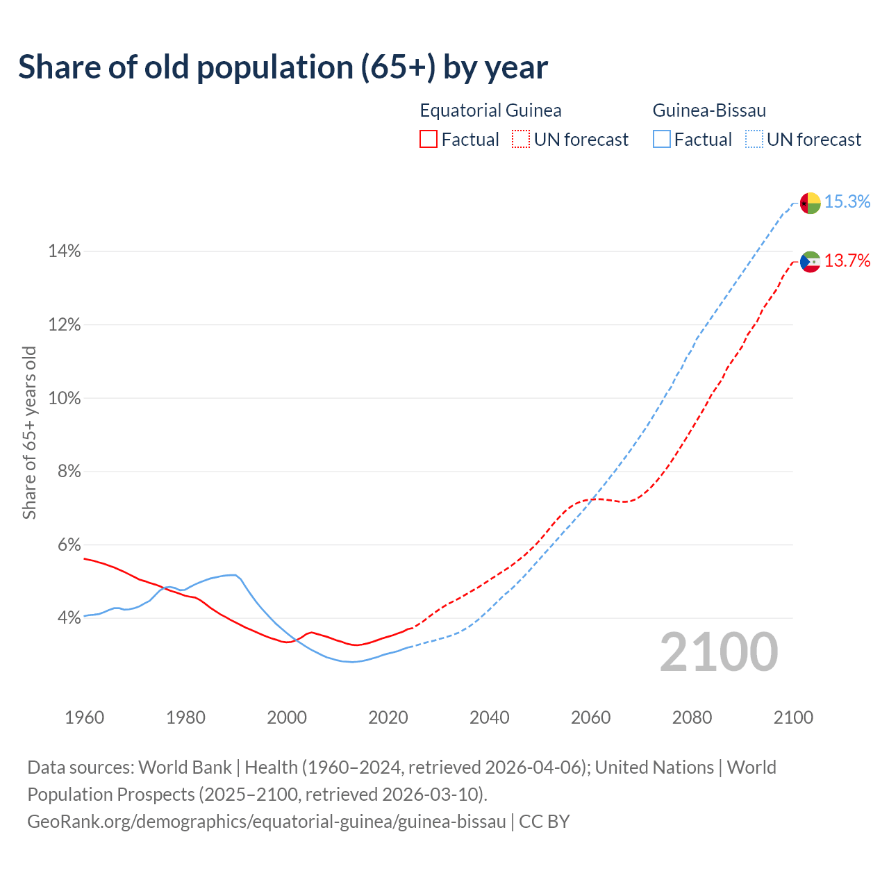 - The share of old-age demographic (65+) in Equatorial Guinea is 3.69% vs 3.19% in Guinea-Bissau.
