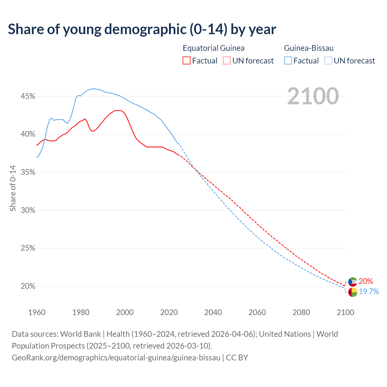 Median age Equatorial Guinea vs Guinea-Bissau, 1960-2100