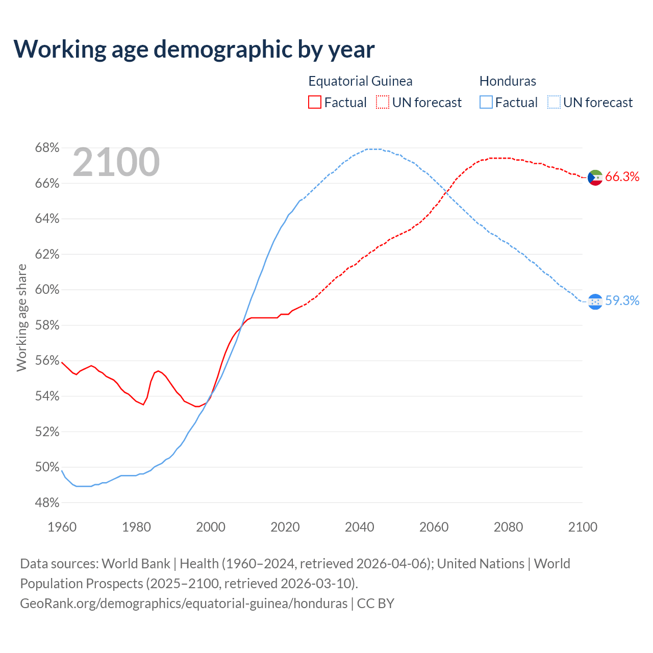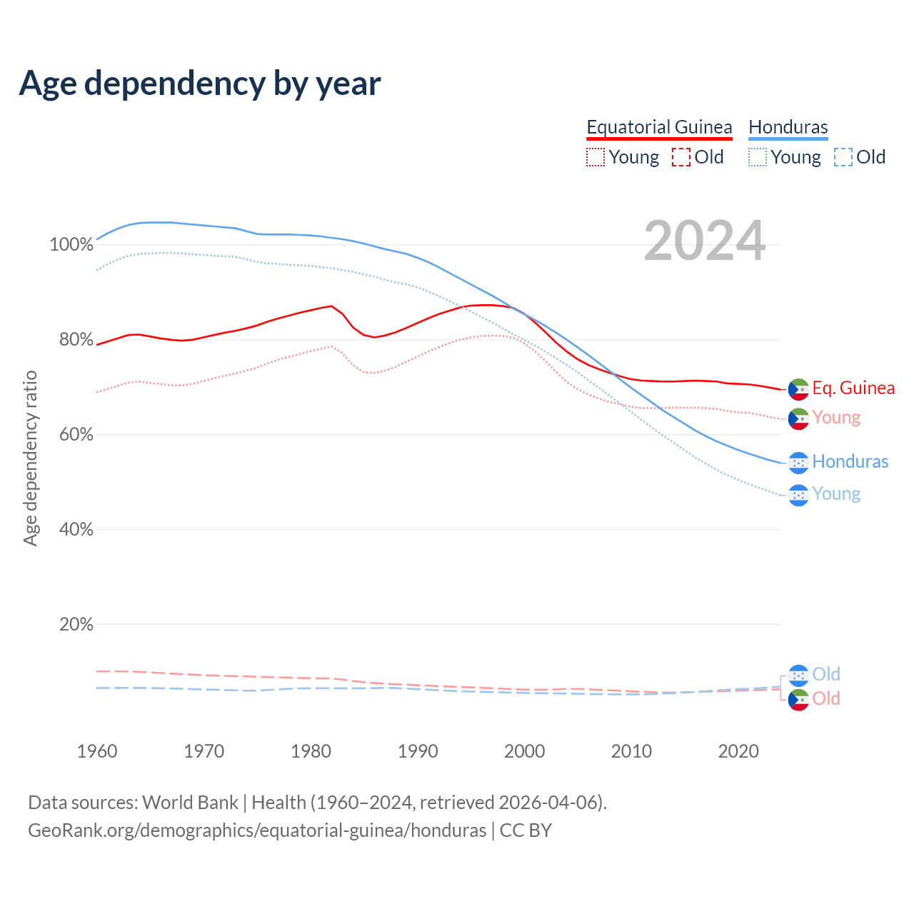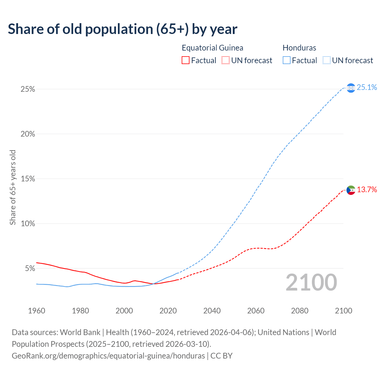 - The share of old-age demographic (65+) in Equatorial Guinea is 3.69% vs 4.42% in Honduras.